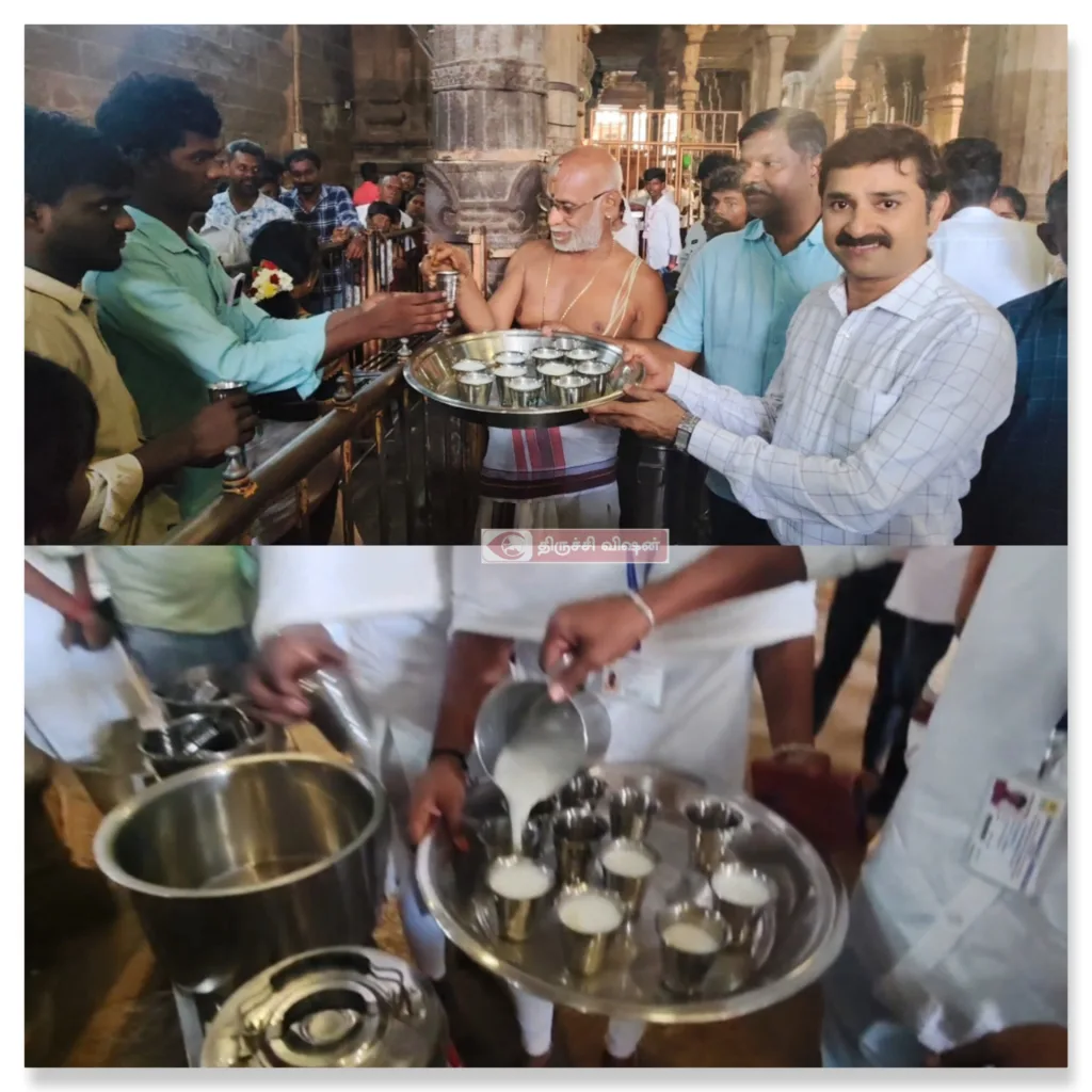 ஸ்ரீரங்கம் அருள்மிகு அரங்கநாதசுவாமி திருக்கோயில்: இன்று புரட்டாசி முதல் சனிக்கிழமையை முன்னிட்டு திருக்கோயில் சார்பாக உபயதாரர் வேதாபால்  உரிமையாளர் ரமேஷ் அவர்களின் உதவியுடன் பக்தர்களுக்கு சூடான பசும்பால் மற்றும் பிஸ்கெட் இணை ஆணையர் சிவராம்குமார் முன்னிலையில் வழங்கப்பட்டது உடன் அர்ச்சகர் சுந்தர் பட்டர்  உள்துறை கண்காணிப்பாளர்கள் வேல்முருன், பரந்தாம கண்ணன் அர்ச்சகர் பயிற்ச்சி பள்ளி தலைமை ஆசிரியர் புலவர் கிருஷ்ணா ஆகியோர் உள்ளனர் புரட்டாசி மாதம் அனைத்து சனிக்கிழமைகளிலும் பால், பிஸ்கட் வழங்கப்படும்.