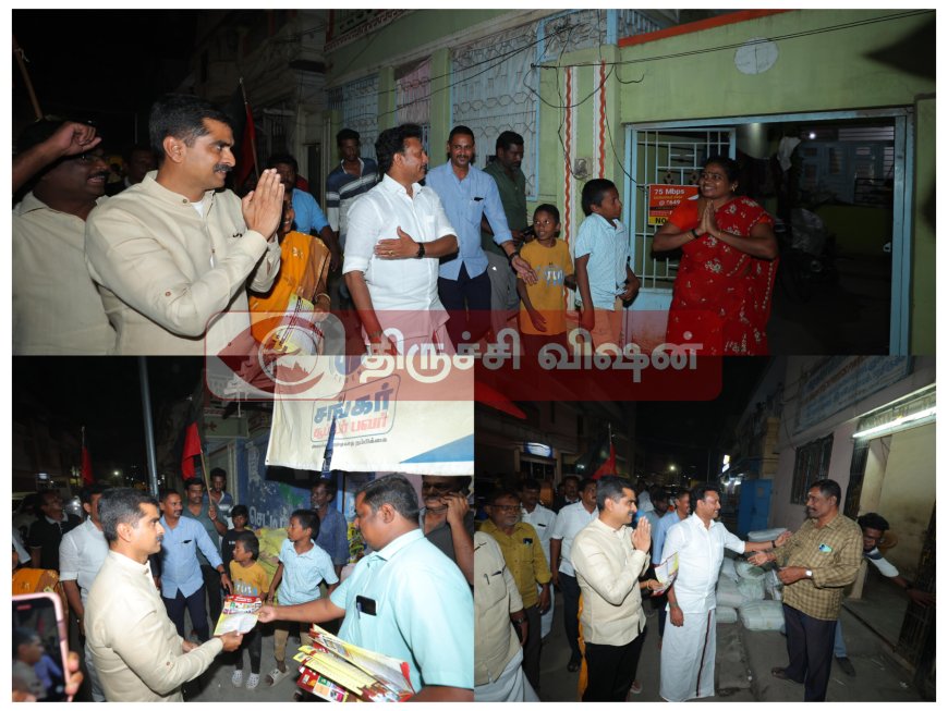 திருச்சி தெற்கு மாவட்டக் கழகச்செயலாளர்- அமைச்சர் அன்பில் மகேஸ் பொய்யாமொழி, திருச்சி நாடாளுமன்ற தொகுதி இந்தியா கூட்டணியின் மறுமலர்ச்சி திமுகவின் வெற்றி வேட்பாளர் துரை வைகோவுடன் மலைக்கோட்டை பகுதி, 13’ஆவது வார்டுக்குட்பட்ட பட்டவர்த் ரோடு பகுதியில் மக்களிடம் துண்டு பிரசுரங்கள் வழங்கி வாக்குகள் சேகரித்தார்.