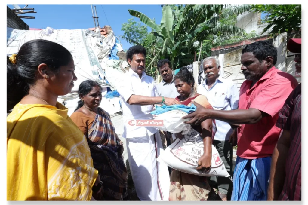 திருவெறும்பூர் சட்டமன்ற தொகுதிக்குட்பட்ட மழையால் சேதாரமான வீட்டினை நேரில் சென்று பார்வையிட்டு பாதிக்கப்பட்டோருக்கு ஆறுதல் கூறி நிவாரணத் தொகை வழங்கிய தமிழக பள்ளி கல்வி துறை அமைச்சர் அன்பில் மகேஸ் பொய்யாமொழி.