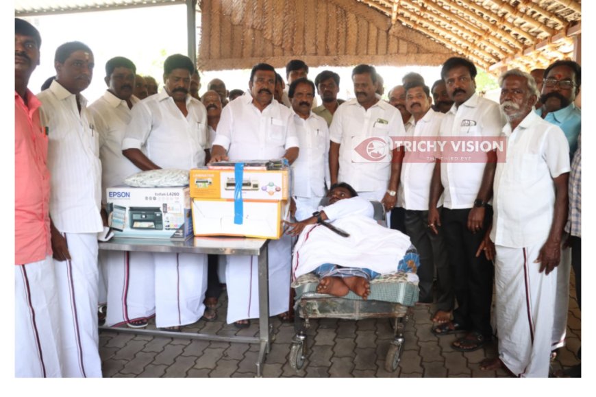 திமுக முதன்மைச் செயலாளரும், நகராட்சி நிர்வாக துறை அமைச்சருமான கே.என்.நேரு, துறையூர் அபினிமங்கலத்தை சேர்ந்த மாற்றுத்திறனாளி செல்வத்திற்கு கலர் பிரிண்டர் ஜெராக்ஸ் மெஷின் ஸ்பைரல் பைண்டிங் மெஷின் லேமினேஷன் மிஷின் உட்பட எலக்ட்ரானிக் சாதனங்களை வழங்கினார்.