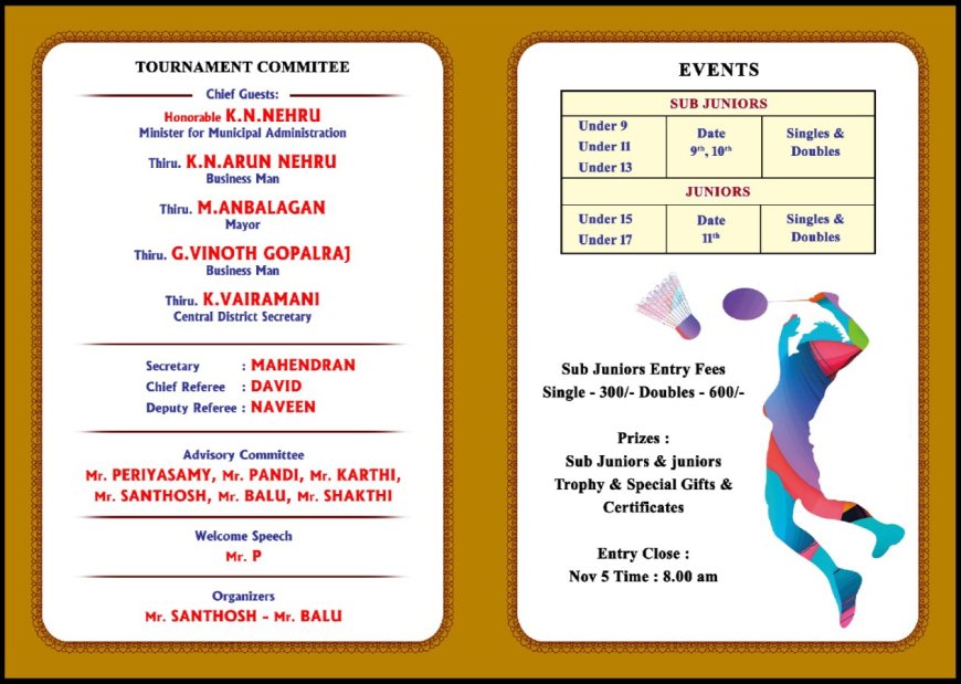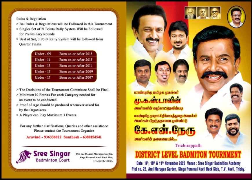திமுக முதன்மைச் செயலாளரும், நகராட்சி நிர்வாகத்துறை அமைச்சருமான கே.என்.நேருவின் பிறந்தநாள் நாளை (09.11.2023) கொண்டாடப்பட உள்ளது. இதையொட்டி கட்சி மற்றும் பல்வேறு தரப்பினர் நலத்திட்ட உதவிகள் வழங்குவர். இதன் ஒரு பகுதியாக மாவட்ட அளவிலான பேட்மிட்டன் போட்டி திருச்சியில் நடைபெற உள்ளது. போட்டி நடைபெறும் நாட்கள், விதிமுறைகள், இடம் மற்றும் மேலும் விபரங்களுக்கு கீழே உள்ள படத்தை பார்க்கவும்.