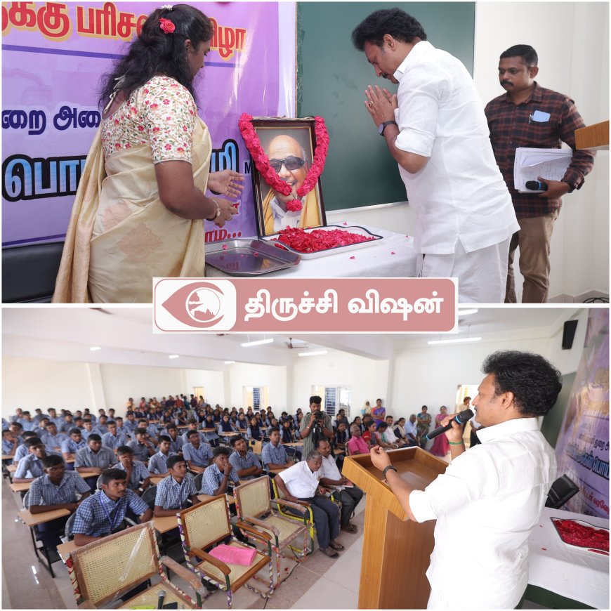 முத்தமிழ் அறிஞர் டாக்டர் கலைஞர் நூற்று இரண்டாவது பிறந்தநாள் விழாவை முன்னிட்டு துவாக்குடி மாதிரி பள்ளியில் நடைபெற்ற பேச்சுப் போட்டியில் கலந்துகொண்ட மாணவர்களை உற்சாகப்படுத்திய அமைச்சர் அன்பில் மகேஸ் பொய்யாமொழி .