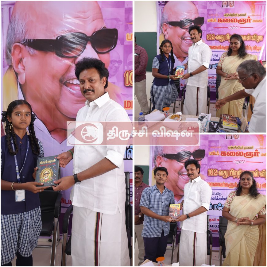 தன் எழுத்தாலும் பேச்சாலும் தமிழினத்தின் உயர்வுக்கு வழிகாட்டிய அறிவுச்சூரியன் முத்தமிழறிஞர் கலைஞர் அவர்களின் 102வது பிறந்தநாளை முன்னிட்டு திருவெறும்பூர் – துவாக்குடியில் அமைந்து ள்ள திருச்சி மாவட்ட அரசு மாதிரிப்பள்ளியில் பேச்சுப்போட்டி நடைபெற்றது.