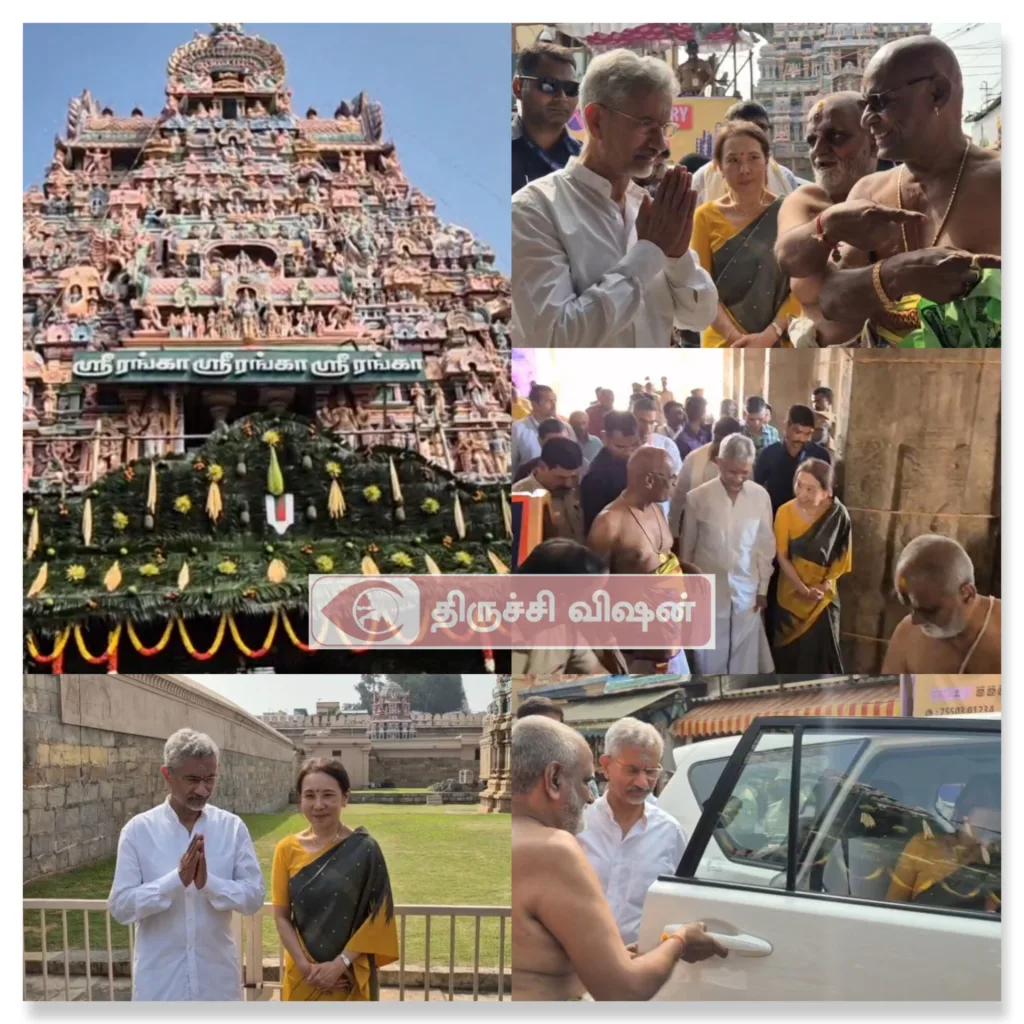 திருச்சியை பூர்வீகமாக கொண்ட மத்திய வெளியுறவுத்துறை அமைச்சர் ஜெய்சங்கர் திருவானைக்காவல் மற்றும் ஸ்ரீரங்கம் கோவிலில் தனது மனைவியுடன் சென்று சுவாமி தரிசனம் செய்தார்.