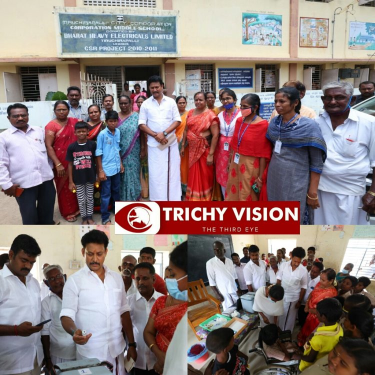 திருச்சி திருவெறும்பூர் தொகுதிக்குட்பட்ட மலைக்கோயில் பகுதியில் உள்ள மாநகராட்சி நடுநிலைப்பள்ளியில் பள்ளிக்கல்வித்துறை அமைச்சர் அன்பில் மகேஷ் பொய்யாமொழி திடீர் ஆய்வு மேற்கொண்டார். பள்ளியில் உள்ள வசதிகள் குறித்தும், தேவைப்படும் மேம்பாட்டு வசதிகள் குறித்தும் தலைமை ஆசிரியரிடம் கேட்டறிந்தார்.
