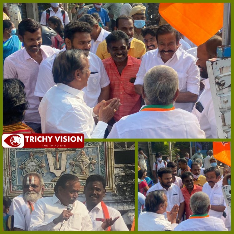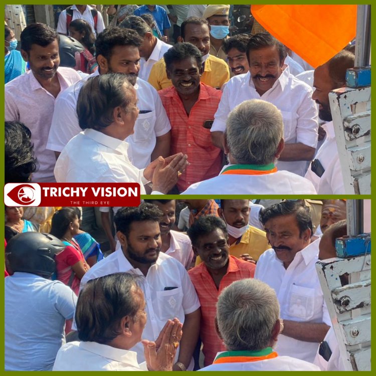 திருச்சி ஸ்ரீரங்கம் 2 வார்டில் போட்டியிடும் கோவிந்தனை ஆதரித்து பாஜக எச்.ராஜா திறந்த வேனில் பரப்புரை மேற்கொண்டார்.அப்போது திமுக அமைச்சர் கே.என்.நேரு அப்பகுதிக்கு வந்த போது பாரதிய ஜனதா எச்.ராஜாவும் கே.என்.நேருவும் ஒருவரை ஒருவர் மாறி நலம் விசாரித்து வாக்கு சேகரித்தனர்.