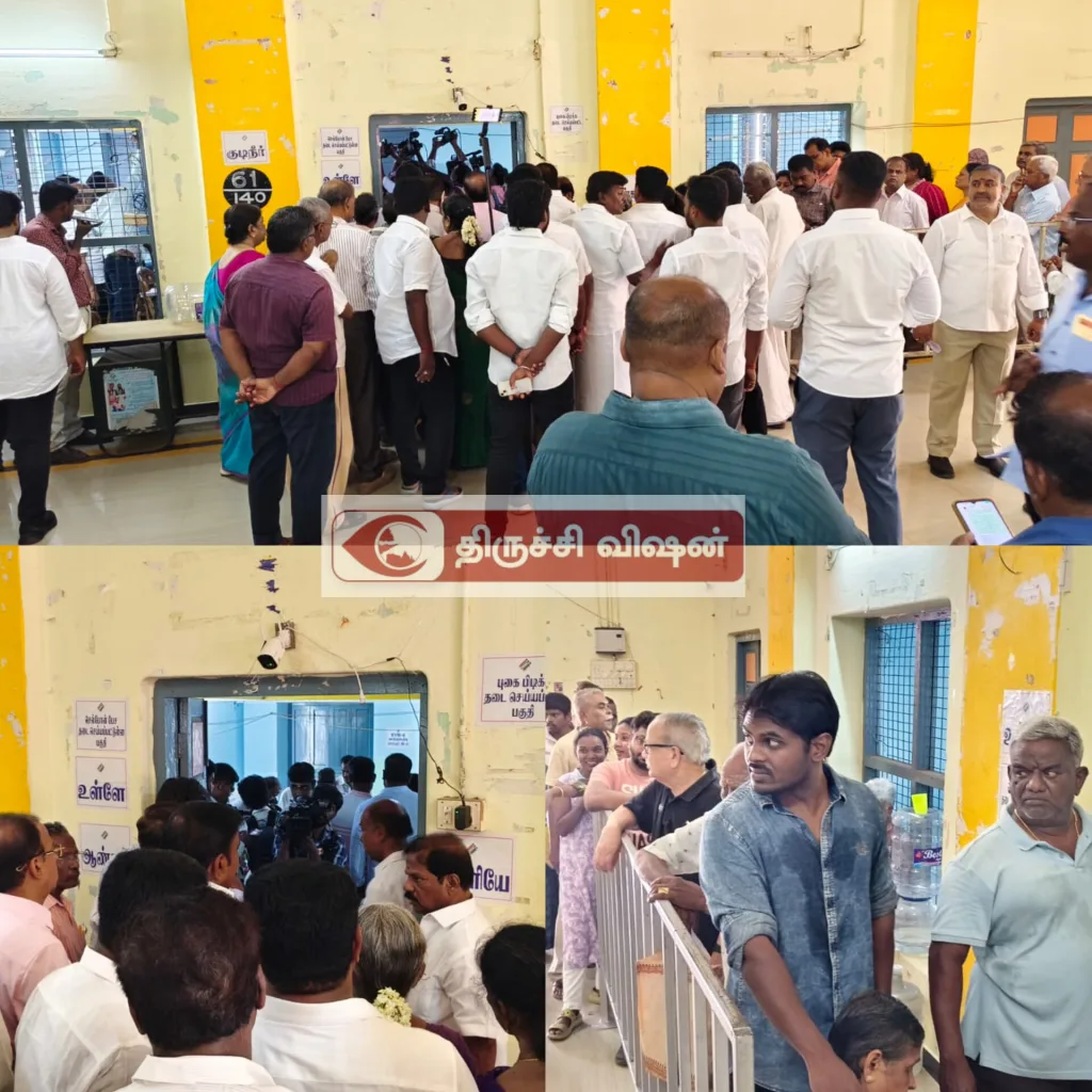 திருச்சி தில்லை நகர் மக்கள் மன்றத்தில் வாக்குச்சாவடி இரண்டிலும் வாக்காளர்கள் காலை 6:45 மணிக்கு வாக்களிக்க நீண்டு வரிசையில் வந்து நின்றனர்.