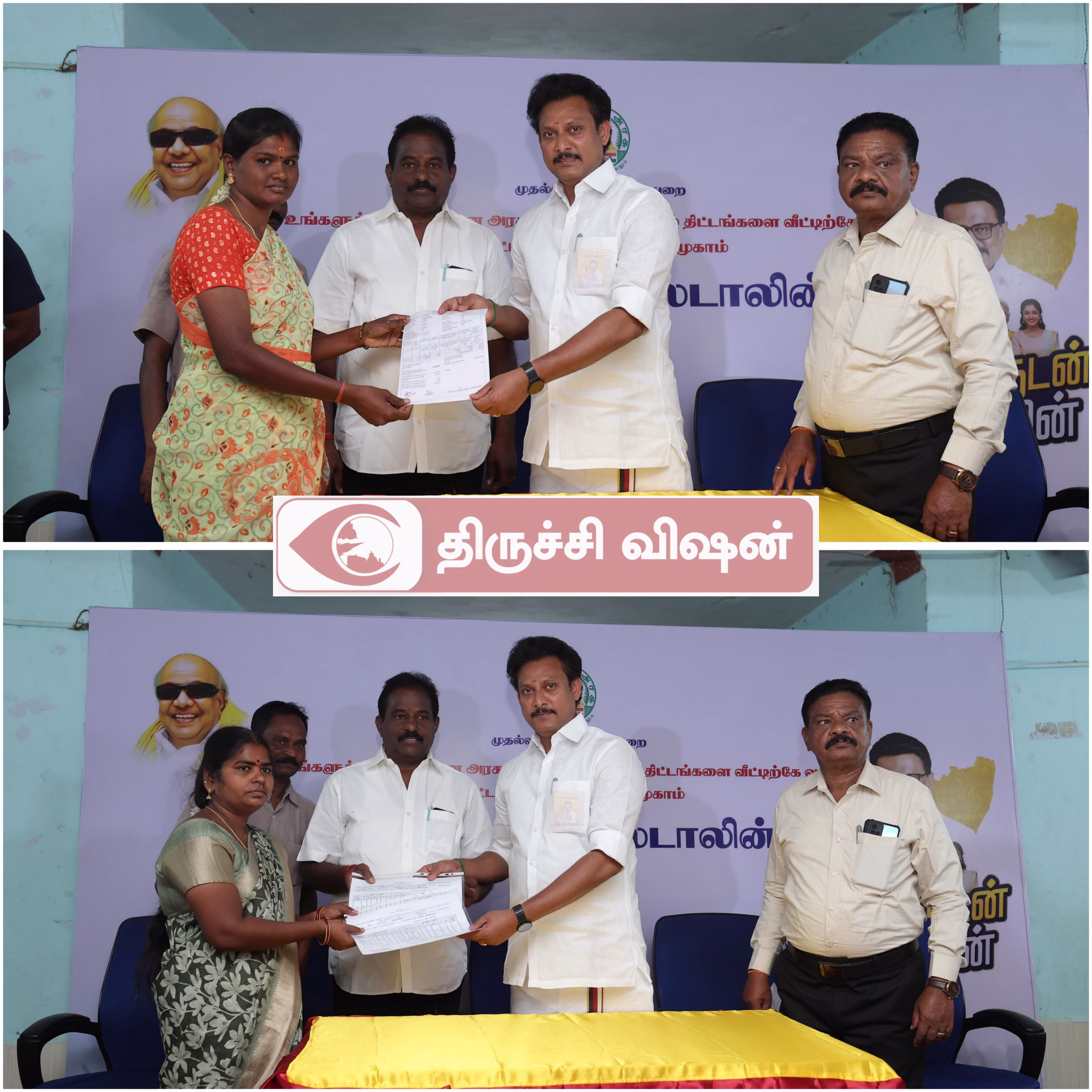 தமிழக பள்ளிக்கல்வித்துறை அமைச்சர் அன்பில் மகேஸ் பொய்யாமொழி சிறப்பு விருந்தினராக கலந்து கொண்டு முகாமை குத்து விளக்கு ஏற்றி தொடக்கி வைத்து வருவாய் பேரிடர் மேலாண்மை துறை சார்பில் நத்தம் பட்டா துவாக்குடி பென்னகரை சேர்ந்த சூரிய குமாரி அக்பர் சாலை சேர்ந்த ராஜேஷ்குமார் ராவுத்தான் மேடை சேர்ந்த சீனிவாசன் ஆகியோருக்கு வழங்கினார்.