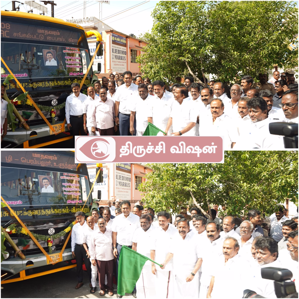 முனையம் வரை , பிற்பகல் 2 .15 மணி முதல் மாதவரத்தில் இருந்து திருச்சி பஞ்சப்பூர் கலைஞர் மு கருணாநிதி ஒருங்கிணைந்த பேருந்து முனையம் வரை, மற்றும் திருச்சி பஞ்சப்பூர் கலைஞர் மு .கருணாநிதி ஒருங்கிணைந்த பேருந்து நிலையத்திலிருந்து இரவு 9. 50 மணிக்கும் இரவு 11. 25 மணிக்கு மாதவரம் வரையும்) நகர்ப்புற வளர்ச்சி துறை அமைச்சர் கே. என். நேரு அவர்கள், போக்குவரத்து துறை அமைச்சர் த.சிவசங்கர் அவர்கள், பள்ளிக்கல்வித்துறை அமைச்சர் அன்பில் மகேஷ் பொய்யாமொழி அவர்கள் ,மாண்புமிகு பிற்படுத்தப்பட்டோர் நலத்துறை அமைச்சர் வீ. மெய்யநாதன் அவர்கள்,