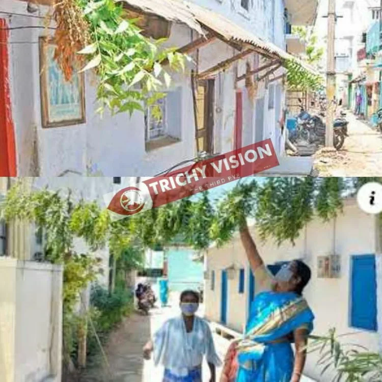 திருச்சி மாவட்டம் உப்பிலியபுரம் அடுத்த கொப்பம்பட்டி கிழங்கு கருங்காடு தெருவைச் சேர்ந்த பொதுமக்கள் தெரு முழுக்க வேப்பிலைத் தோரணம் கட்டி வருகின்றனர்.
