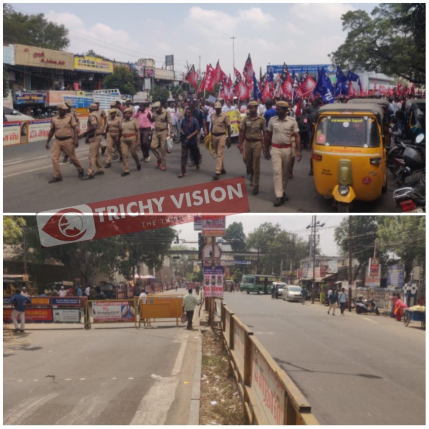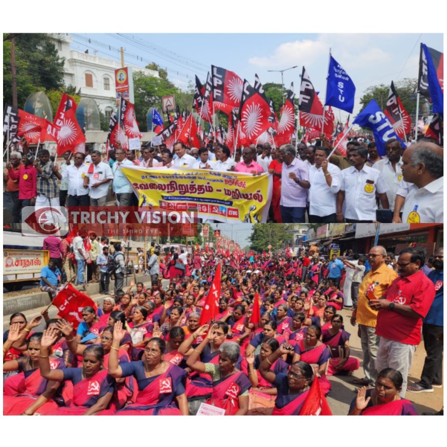 அந்த வேலை நிறுத்த போராட்டத்தின் ஒரு பகுதியாக திருச்சியில் தொ.மு.ச, ஏ.ஐ.டி.யூ.சி, சி.ஐ.டி.யூ, ஐ.என்.டி.யூ.சி உள்ளிட்ட பல்வேறு தொழிற்சங்கம் சார்பில் திருச்சி மலைக்கோட்டை தெப்பக்குளம் தபால் நிலையம் அருகே சாலை மறியல் போராட்டம் நடைபெற்றது. முன்னதாக தொழிற்சங்கத்தை சேர்ந்தவர்கள் சத்திரம் பேருந்து நிலையத்திலிருந்து ஊர்வலமாக புறப்பட்டு தெப்பக்குளம் தபால் நிலையம் அருகே வந்தவர்களை போலீசார் தடுத்து நிறுத்தினர். அதனையடுத்து போராட்டக்காரர்கள் அனைவரும் சாலையில் அமர்ந்து மறியல் போராட்டத்தில் ஈடுபட்டனர். போராட்டத்தின் போது மத்திய அரசை கண்டித்து முழக்கங்களை எழுப்பினர். தொடர்ந்து போராட்டத்தில் ஈடுபட்டவர்களில் சுமார் 700 பேரை போலீசார் கைது செய்தனர்.