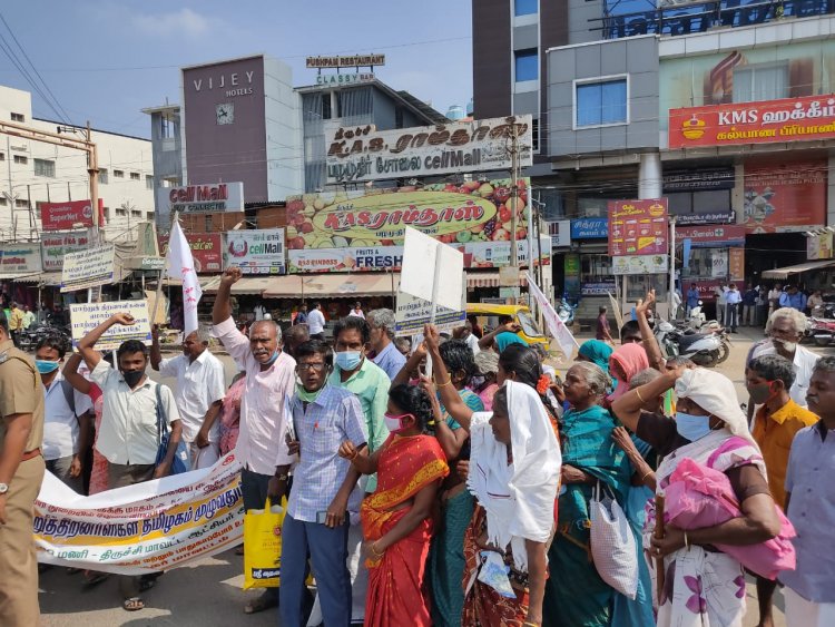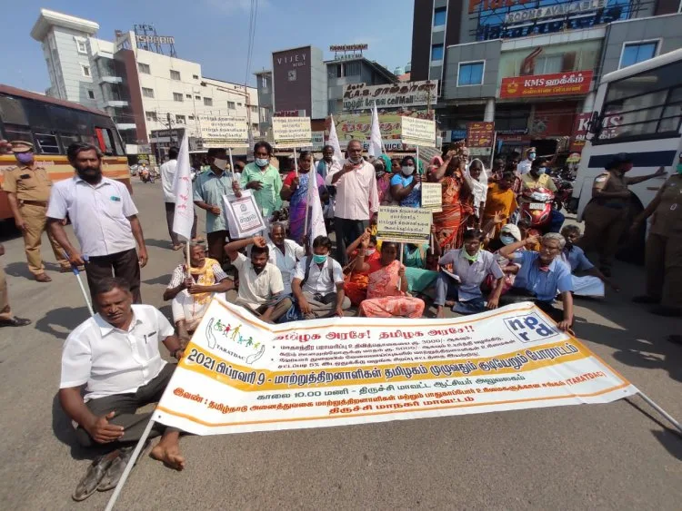 மாற்றுத் திறனாளிகளுக்கான மாதாந்திர உதவித்தொகையை உயர்த்தி வழங்க மறுக்கும் தமிழக அரசை கண்டித்து மத்திய பேருந்து நிலையத்தில் மறியல் போராட்டத்தில் ஈடுபட்ட 50க்கும் மேற்பட்ட மாற்றுத்திறனாளிகள் கைது.