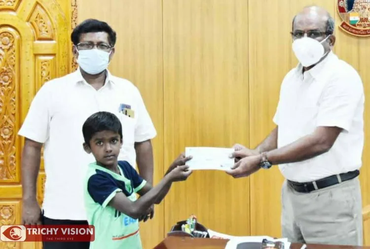 திருச்சி மாவட்டம் மணப்பாறை அடுத்த தே.துலுக்கம்பட்டியில் கிணற்றில் விழுந்த சிறுமி லித்திகா-வை மீட்ட 9 வயது சிறுவன் லோஹித்தின் துணிச்சலான செயலினை அறிந்து மாவட்ட ஆட்சித்தலைவர் சிவராசு சிறுவனை மாவட்ட ஆட்சியரகத்திற்கு நேரில் வரவழைத்து ரூ.5 ஆயிரத்திற்கான காசோலையினை வழங்கி பாராட்டினார்.