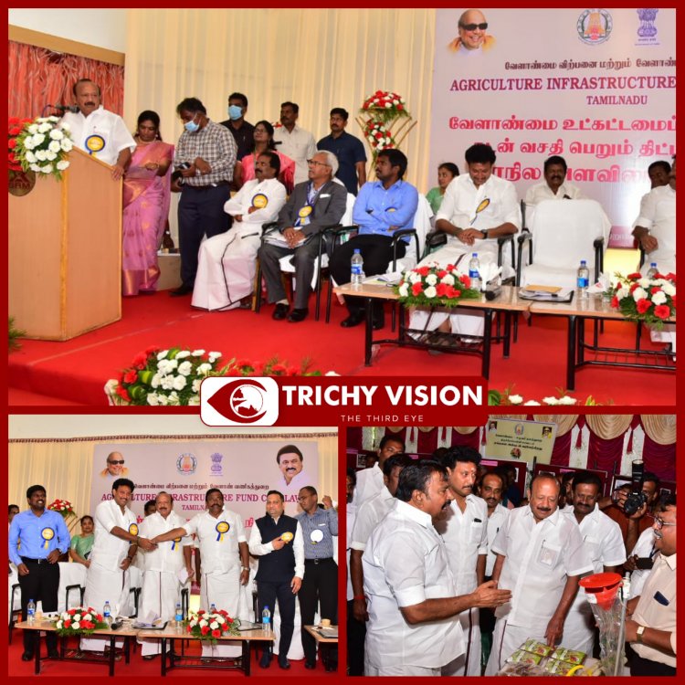 வேளாண்மை விற்பனை மற்றும் வேளாண் வணிகத்துறையின் சார்பில் திருச்சியில் வேளாண்மை உட்கட்டமைப்பு நிதியின் கீழ் கடன் வசதி பெறும் திட்டம் குறித்த மாநில அளவிலான கருத்தரங்கு நடைபெற்றது. இவ்விழாவினை நகராட்சி நிர்வாகத்துறை அமைச்சர் கே.என்.நேரு, வேளாண்-உழவர் நலத்துறை அமைச்சர் எம்.ஆர்.கே.பன்னீர்செல்வம் மற்றும் பள்ளிக்கல்வித்துறை அமைச்சர் அன்பில் மகேஷ் பொய்யாமொழி ஆகியோர் குத்துவிளக்கேற்றி துவக்கிவைத்தார்.