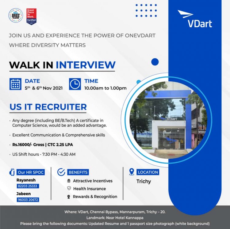 திருச்சியில் செயல்பட்டு வரும் VDart நிறுவனத்தில் வேலை வாய்ப்புகள் அறிவிக்கப்பட்டுள்ளது. மேலும் விபரங்களுக்கு கீழே உள்ள படத்தை பார்க்கவும்.