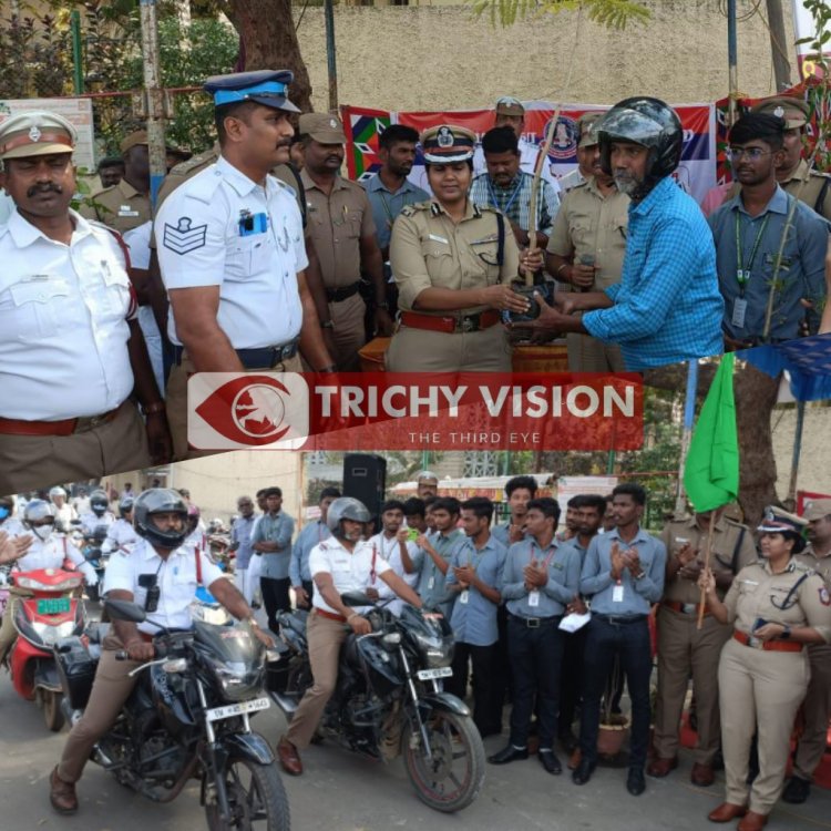 தலைக்கவசம் அணிவதன் அவசியத்தை வலியுறுத்தி திருச்சி மாநகர காவல் துறை சார்பில் இருசக்கர வாகன பேரணி நடைபெற்றது. போக்குவரத்து காவல்துறை மற்றும் புனித வளனார் கல்லூரி மாணவர்கள் பங்கேற்ற விழிப்புணர்வு பேரணியை திருச்சி மாநகர காவல் துறை ஆணையர் சத்யபிரியா கொடியசைத்து துவக்கி வைத்தார்.