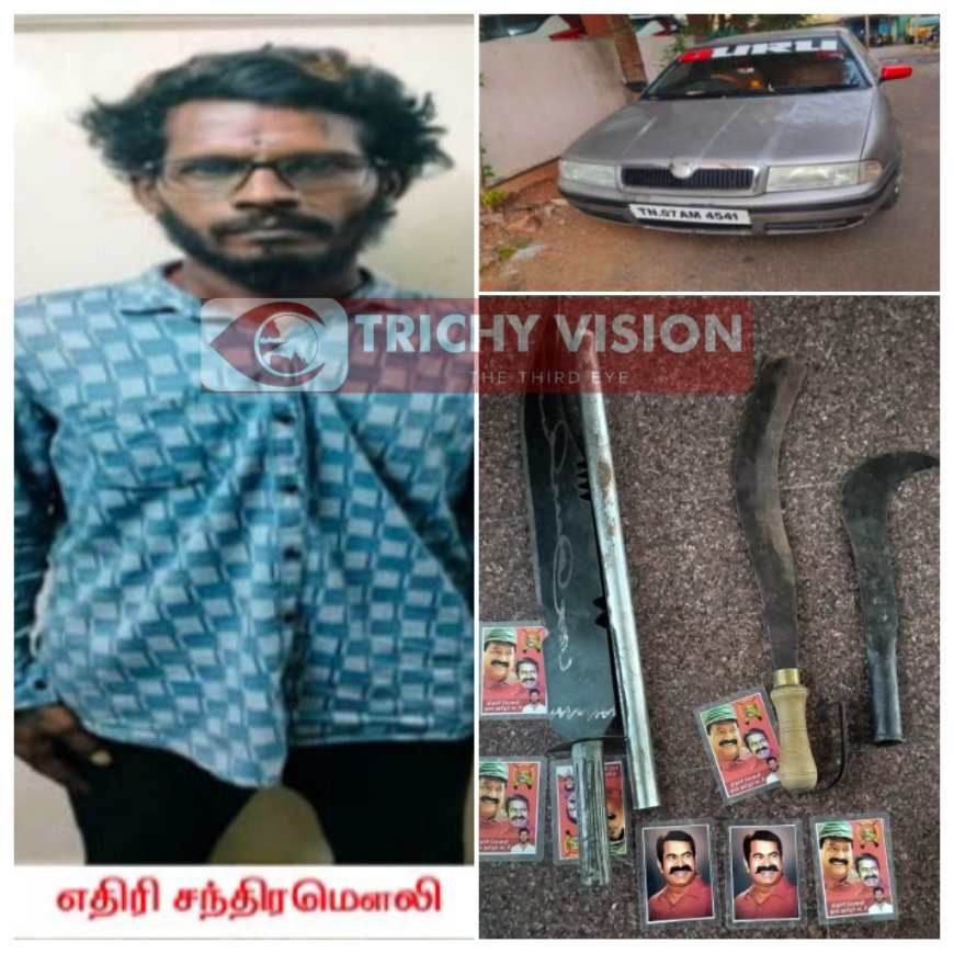 மேற்படி காரை சோதனை செய்ததில், காரின் உள்ளே அருவாள்-1. இரும்பு வாள்-2. இரும்பு ராடு 1 போன்ற உயிருக்கு ஆபத்தை ஏற்படுத்தும் வகையில் இருந்த ஆயுதங்களுடன், காரில் இருந்த ஒரு நபரும் கைது செய்யப்பட்டார். மேற்படி காரில் இருந்த நபரான திருச்சி எடமலைப்பட்டிபுதூரைச் சேர்ந்த சந்திரமௌலி என்ற மௌலி (39) என்பவரிடம் விசாரணை மேற்கொண்ட போது அவர் நாம் தமிழர் கட்சியின் மாவட்ட பொருளாளராக பதவி வகித்தவர் எனவும், எடமலைப்பட்டிபுதூர் காவல் நிலைய சரித்திரப்பதிவேடு குற்றவாளி எனவும், காரில் இருந்து தப்பி ஓடிய இரண்டு நபர்களும் நாம் தமிழர் கட்சியினை சார்ந்த நிர்வாகிகள் எனவும் விசாரணையில் தெரிய வருகிறது.