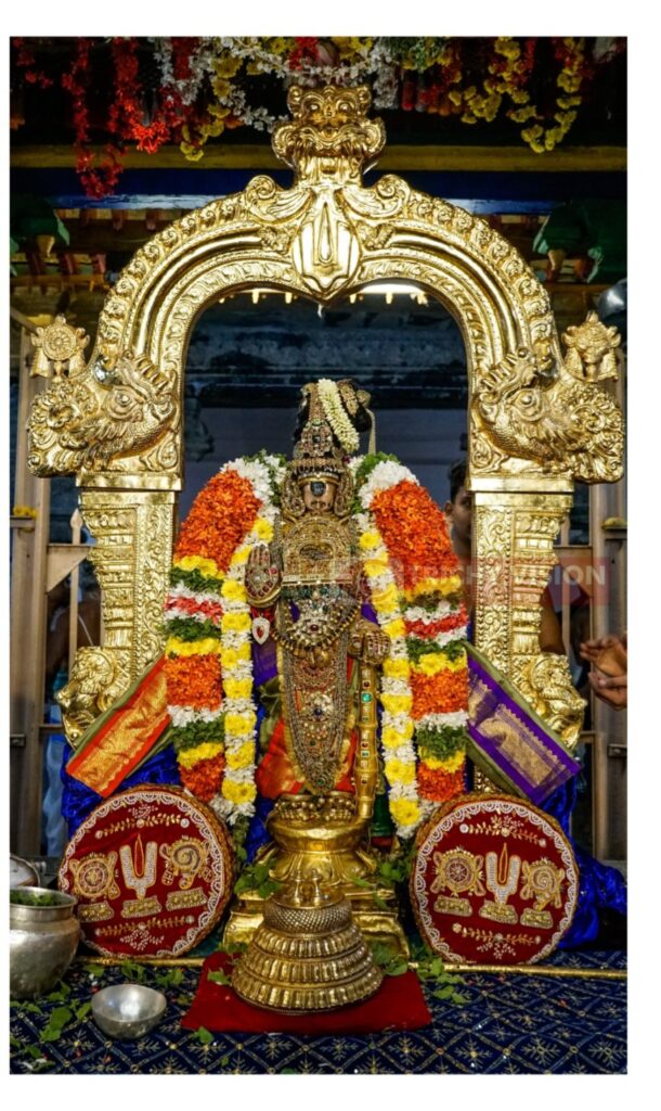 பின்புறம் – புஜ கீர்த்தி; அண்ட பேரண்ட பக்ஷி பதக்கம்; காசு மாலையும் தழைந்து வரும் படி சாற்றி; கையில் தாயத்து சரங்கள்; தங்க தண்டைகள் திருவடியில் அணிந்து அர்ச்சுன மண்டபத்தில் எழுந்தருளி சேவை சாதிக்கிறார்.