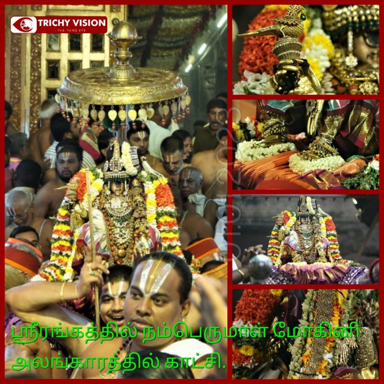 திருச்சி ஸ்ரீரங்கத்தில் கடந்த (22.12.2022)ம் தேதி வைகுண்ட ஏகாதசி பெருவிழா தொடங்கியது. இதையொட்டி தினமும் நம்பெருமாள் விஷேச அலங்காரத்தில் பக்தர்களுக்கு காட்சி தருகிறார். இதில் இன்று மோகினி அலங்காரம் எனும் நாச்சியார் திருக்கோலத்தில் காட்சி தந்தார்.