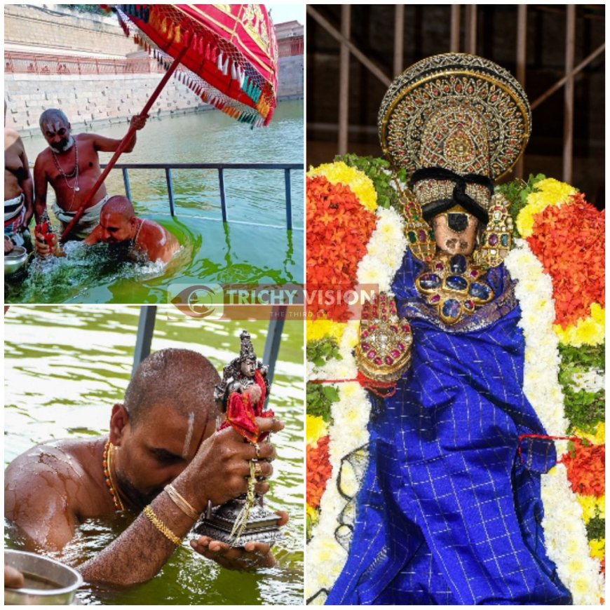 ராப்பத்து உற்சவத்தின் 10ம் நாளான இன்று நம்பெருமாள் மூலஸ்தானத்திலிருந்து புறப்பட்டு பரமபதவாசல் வழியாக சந்திரபுஷ்கரணி குளத்திற்கு தீர்த்தபேரர் உடன் வந்தார். அங்கு நம்பெருமாளுக்கு பதிலாக தீர்த்தபேரர் சந்திரபுஷ்கரணி குளத்தில் புனித நீராடினார். நம்பெருமாள் கரையில் ‘நின்ற வாறு சந்திரபுஷ்கரணியில் தீர்த்தவாரியை கண்டருளுளினார்.