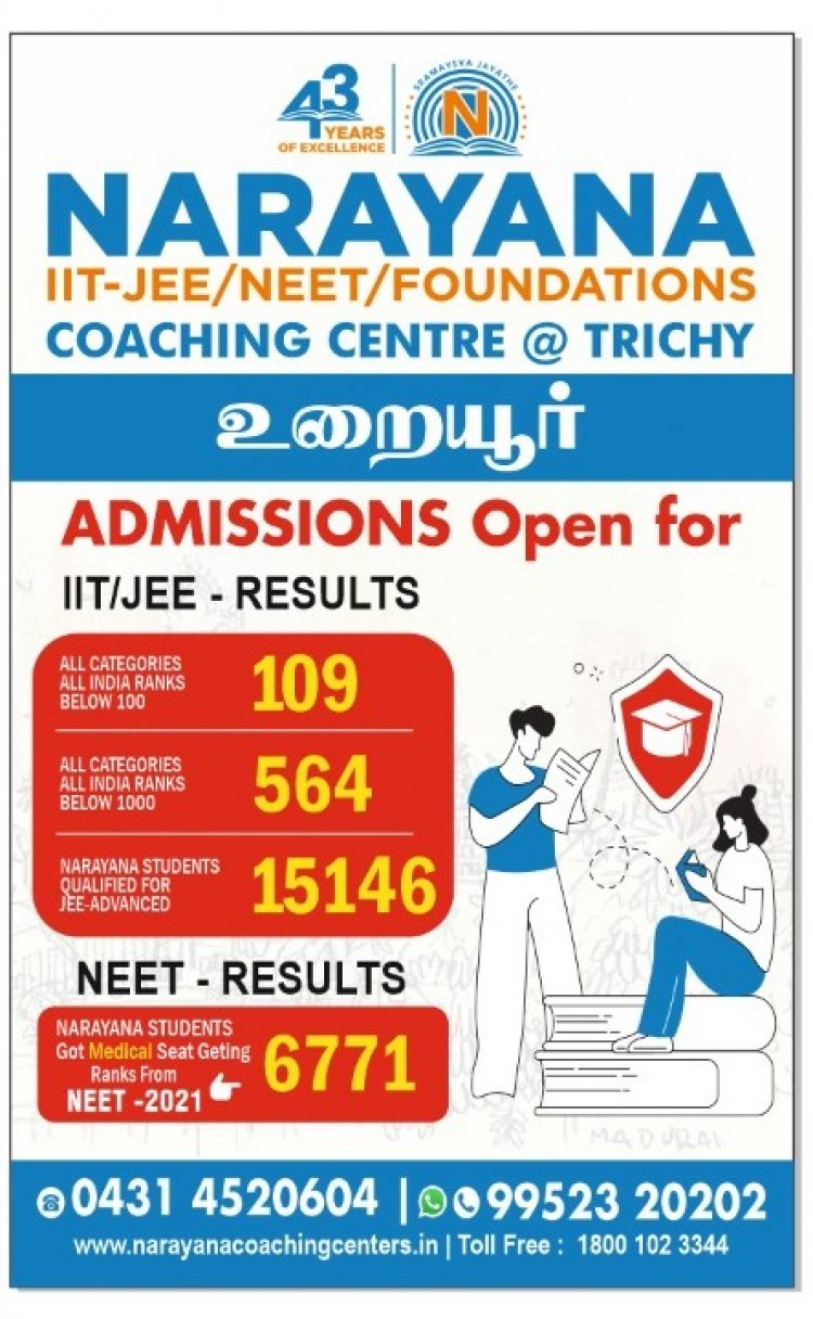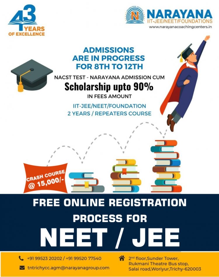 அவர்களுக்கு வழிகாட்டும் விதமாக 43 ஆண்டு காலமாக தனித்துவத்தோடு செயல்பட்டு வருகிறது நாராயணா கோச்சிங் சென்டர்.மதுரை,சேலம், திருச்சி ஆகிய நகரங்களில் இந்த சென்டர்களில் படித்து மாணவர்கள்பயன்பெற்று வருகின்றனர்.அடுத்த முயற்சியாக திருச்சியில் மற்றுமொரு பிரிவு உறையூர் சாலை ரோட்டில்தொடங்கப்பட்டுள்ளது.