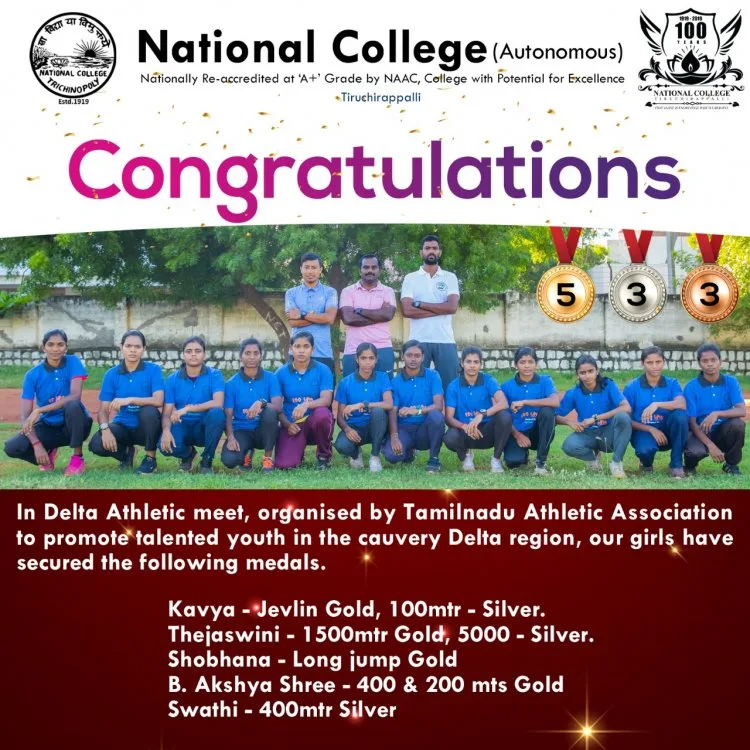 இதில் திருச்சி தேசிய கல்லூரி மாணவர்கள் பங்கேற்று சிறப்பாக விளையாடி பதக்கங்களையும் வென்றுள்ளனர்.
