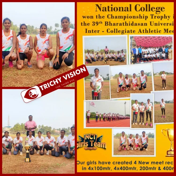 திருச்சி பாரதிதாசன் பல்கலை இடையேயான 39 ஆவது தடகளப் போட்டியில் சாம்பியன் பட்டம் பெற்று, திருச்சி தேசிய கல்லூரி மாணவிகள் சாதனை படைத்துள்ளனர்.