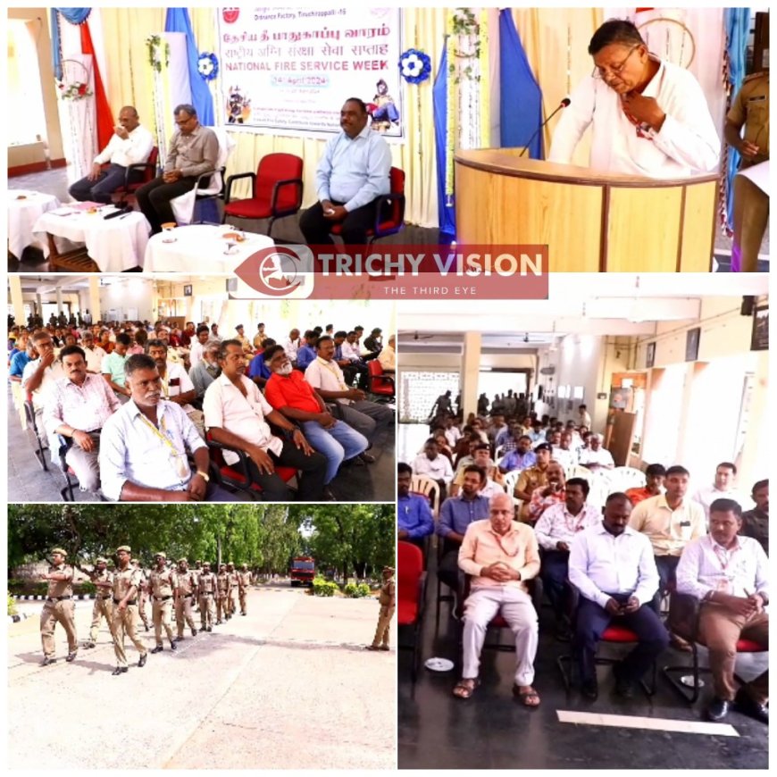 திருச்சி மாவட்டம் திருவெறும்பூர் அருகே உள்ள துப்பாக்கி தொழிற்சாலையில் நடந்த தீ தடுப்பு வார விழாவிற்கு துப்பாக்கி தொழிற்சாலை நிர்வாக இயக்குனர் ஷிரிஷ்குமார் பாதுகாப்பு மற்றும் சேவையின் கொடியை ஏற்றி வைத்து தீ பாதுகாப்பு வார விழாவை தொடங்கி வைத்தார்.