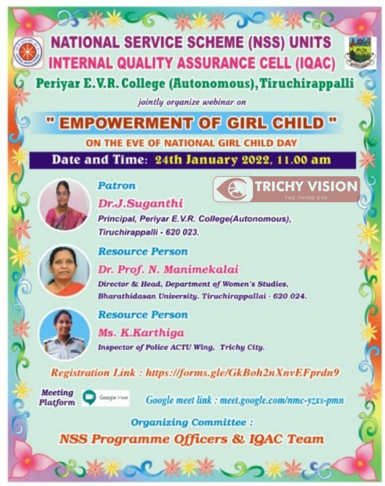 திருச்சி ஈவெரா பெரியார் கல்லூரியில் தேசியபெண் குழந்தைகள் தின விழாவைவை முன்னிட்டு வருகிற ஜனவரி 24-ஆம் தேதி திங்கட்கிழமை அன்று இணையவழி கருத்தரங்கு நடைபெற உள்ளது.கல்லூரியின் நாட்டு நலப்பணித் திட்டம் மற்றும் IQAC சார்பில் கருத்தரங்கு நடைபெற உள்ளது.