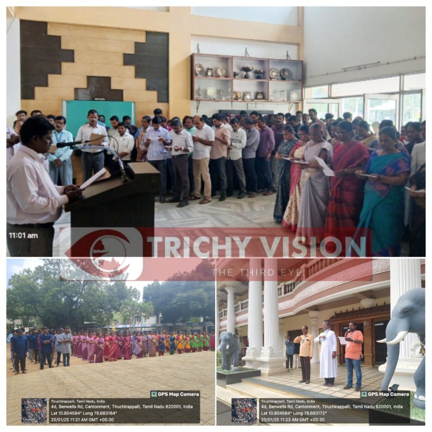 தேசிய வாக்காளர் தினத்தையொட்டி திருச்சிராப்பள்ளி மாவட்டத்தில் உள்ள தமிழ்நாடு அரசு போக்குவரத்துக் கழகம் திருச்சிராப்பள்ளி மண்டல அலுவலகத்தில் தேசிய வாக்காளர் தின உறுதிமொழி போக்குவரத்து கழக திருச்சி மண்டல பொது மேலாளர் ஆ.முத்துகிருஷ்ணன் தலைமையில் அனைத்து போக்குவரத்து கழக பணியாளர்கள் உறுதிமொழி இன்று (25.01.2025) எடுத்துக் கொண்டனர்.