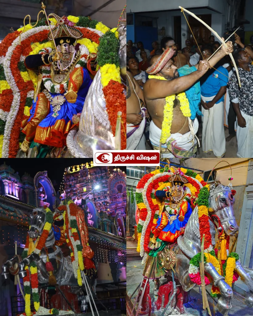 திருச்சி, சமயபுரம், அருள்மிகு மாரியம்மன் திருக்கோயில் நவராத்திரி திருவிழா பத்தாம் நாள் வெள்ளி குதிரை வாகனத்தில் பரிவேட்டைக்கு புறப்பட்டு வன்னி மரத்தடியில் அம்பு போடும் நிகழ்ச்சி நடைபெற்றது. அம்பாளுக்கு சிறப்பு தீபாராதனை நடைபெற்று திருவாதி உலா கண்டு பக்தர்களுக்கு அருள் பாலித்தார்
