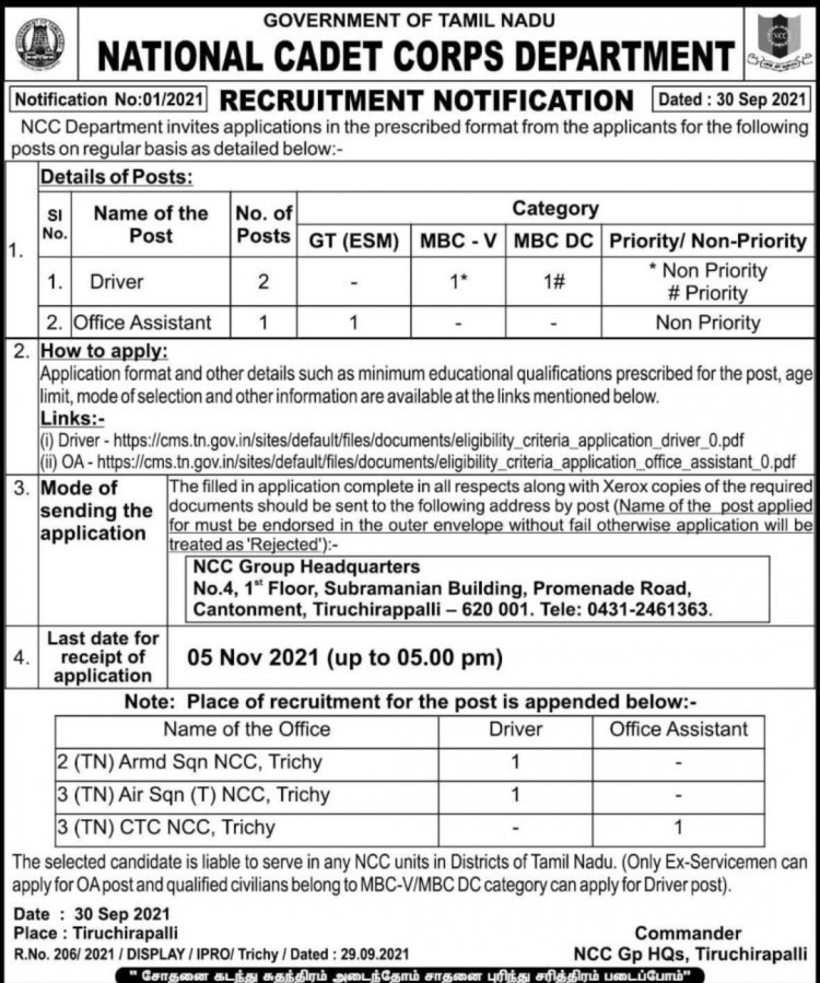 திருச்சியில் உள்ள தேசிய மாணவர் படையில் ஓட்டுநர்,அலுவலக உதவியாளர் ஆகிய இரண்டு பணிகளுக்கு காலிப்பணியிட அறிவிப்பு வெளியாகி உள்ளது.