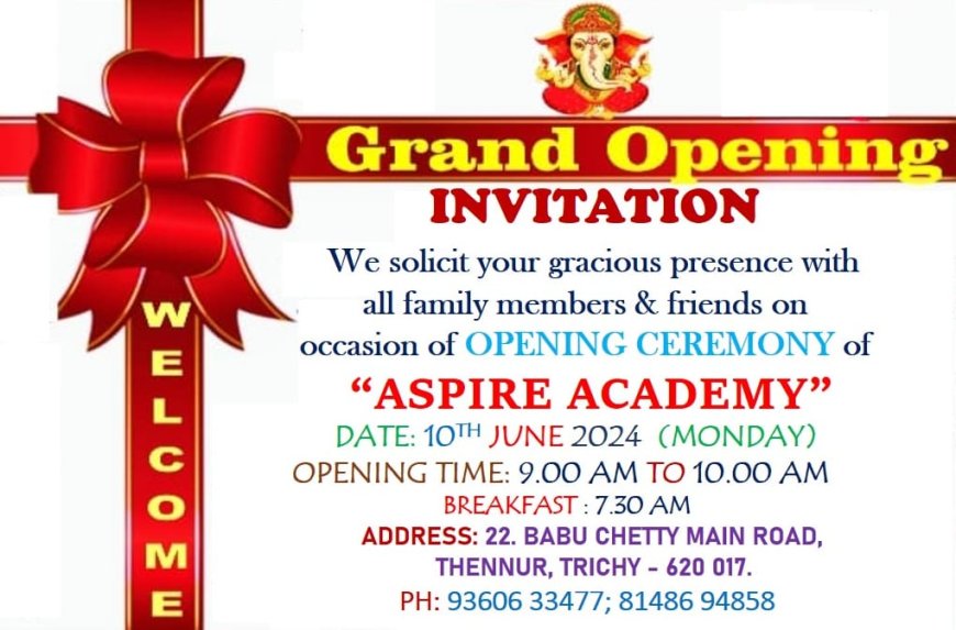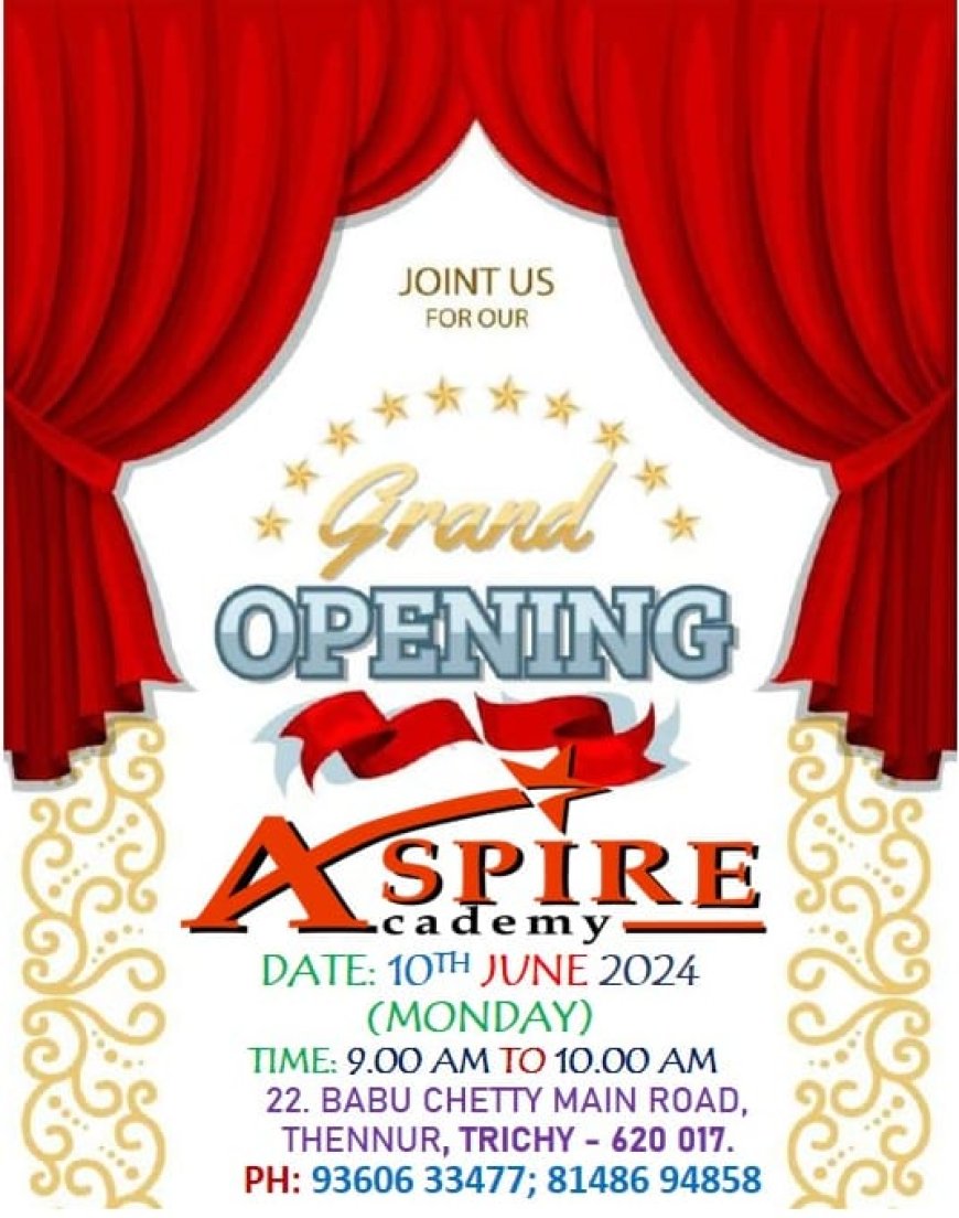 திருச்சி தென்னூர் பாபு செட்டி மெயில் ரோட்டில் புதியதோர் Aspire Academy தொடங்க உள்ளது. நாளை (10.06.2024) காலை 09:00 முதல் 10:00க்குள் திறப்பு விழா நடைபெற உள்ளது.