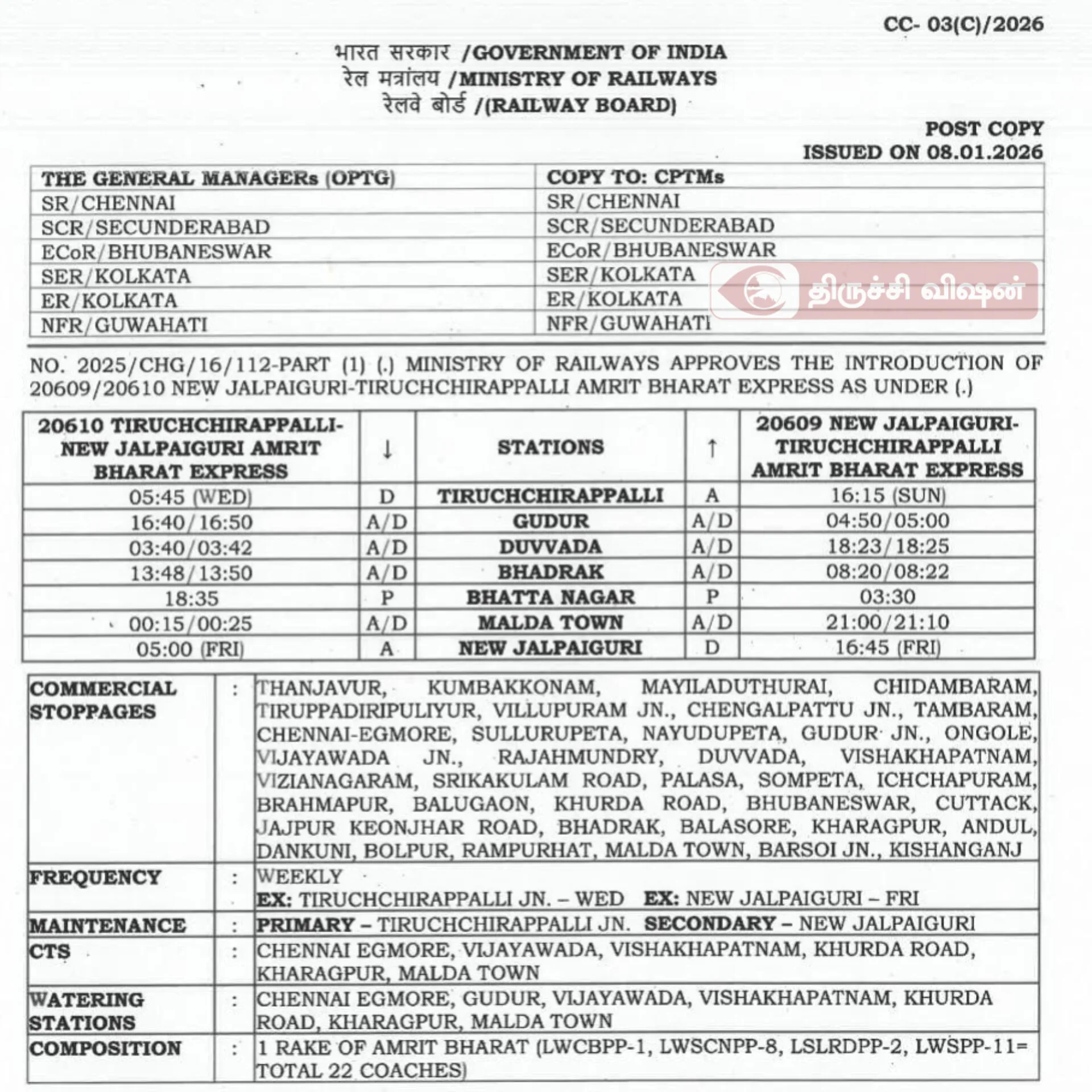 அம்ரித் பாரத் விரைவு இரயில் திட்டத்தின் கீழ் புதிதாக அறிமுகப்படுத்தப்பட்டுள்ள, புது ஜல்பைகுரி – திருச்சி இரயில் சேவைக்கு மனமார்ந்த நன்றி!