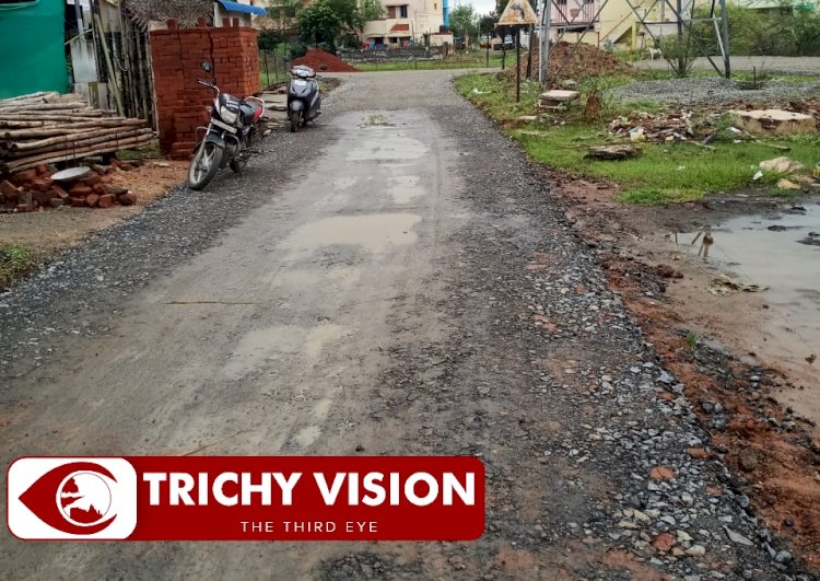 அதன் ஒரு பகுதியாக அங்குள்ள சாலையை அகற்றி புதிதாக மேலே ஜல்லி மற்றும் கற்கள் போட்டு புதிய தார்சாலை அமைக்கும் பணிகள் நடைபெற்று வந்தன. இதில் முதற்கட்ட பணிகள் நடைபெற்ற நிலையில் இன்னும் தார் ஊற்றப்படாத நிலையில் திருச்சியில் கடந்த சில நாட்களாக மழை பெய்து வருவதால் சாலையில் பல இடங்களில் பள்ளங்கள் விழுந்து காணப்பட்டுள்ளது.