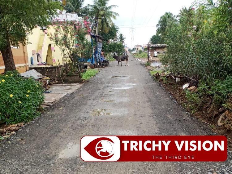 திருச்சி தீரன் நகர் பகுதியில் புதிதாக அமைக்கப்பட்ட சாலை மழையால் பள்ளங்கள் விழுந்து சேதமடைந்துள்ளதால் சாலையை மீண்டும் மாற்றி அமைக்க வேண்டும் என கிராம மக்கள் கோரிக்கை வைத்துள்ளனர்.