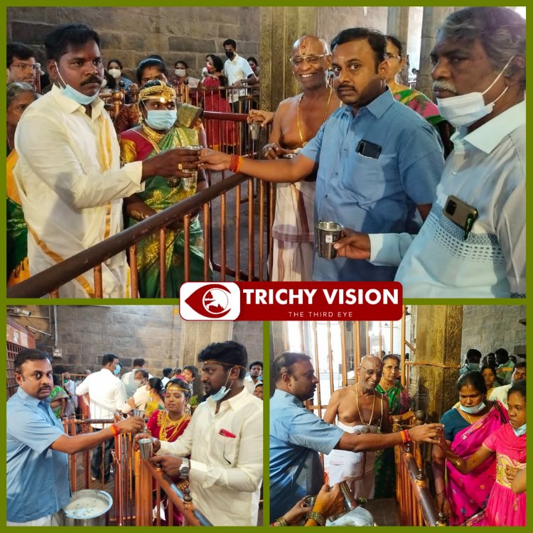 இந்நிகழ்வில் உதவி ஆணையர் கந்தசாமி, உள்துறை கண்காணிப்பாளர் வேல்முருகன், உதவி கண்காணிப்பாளர் பி.ஆர்.கிருஷ்ணா மற்றும் அர்ச்சகர் சுந்தர் பட்டர் ஆகியோர் உடனிருந்தனர். இன்று முதல் கோடை காலம் முழுவதும் உபயமாக மூலிகை மோர் வழங்க திருச்சி வேதா பால் நிறுவனர் ரமேஷ் முன் வந்துள்ளார்.