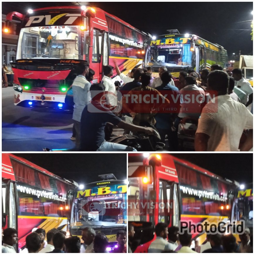 விரைவாகவும், சொகுசாகவும் செல்வதற்கு பெரும்பாலான பயணிகள் ஆம்னி பேருந்துகளை நாடுகின்றனர். இது ஒரு புறம் இருக்க ஆம்னி பேருந்துகளில் அதிக கட்டணம் வசூலிப்பதாக அடிக்கடி குற்றச்சாட்டு எழுந்து வருகிறது. இந்த நிலையில் திருச்சி மத்திய பேருந்து நிலையத்தில் பயணிகளை ஏற்றுவதற்கு இரு பேருந்துகளுக்கிடையே போட்டி ஏற்பட்டதில் ஒரு பேருந்துடன் மற்றொரு பேருந்து மோதி விபத்துக்குள்ளானது.