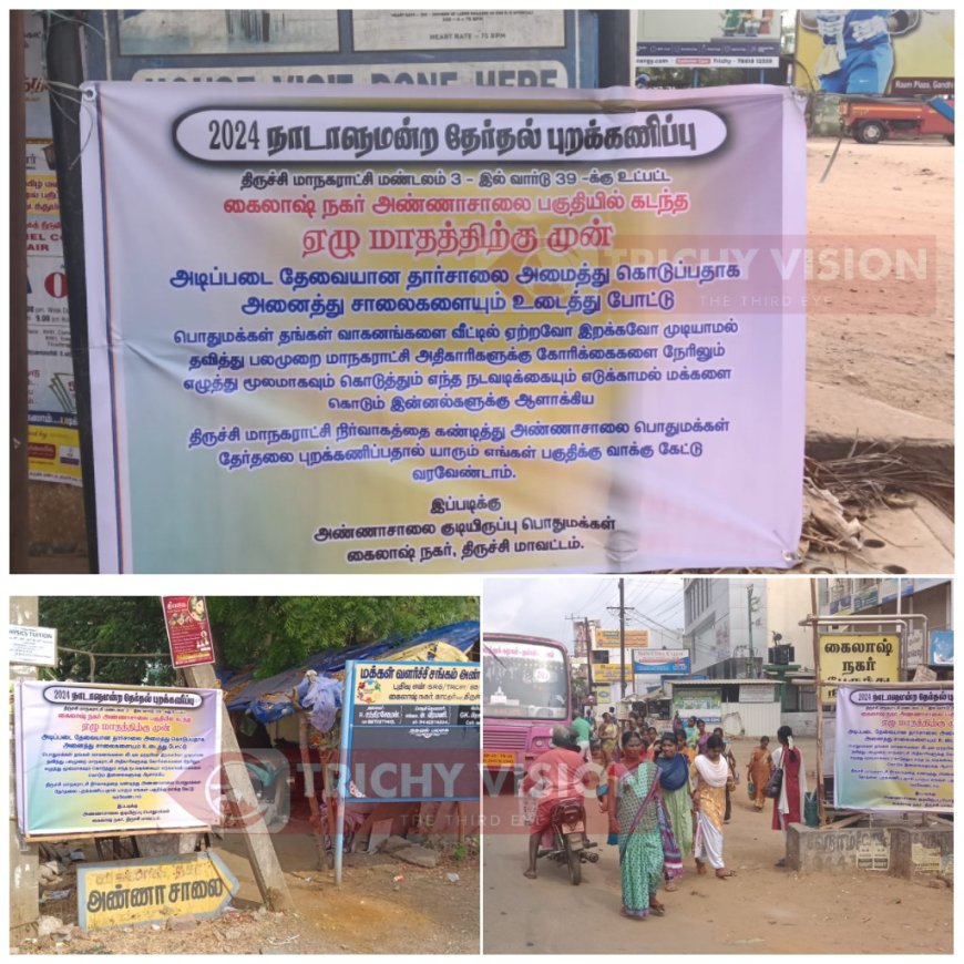 ஆனால் சாலையை போடவில்லை இதனால் பொதுமக்களும் வாகன ஓட்டிகளும், பாதசாரிகள் சாலைகளில் சென்று வருவதற்கு பெரும் சிரமத்திற்கு உள்ளாகி வருகின்றனர். இது குறித்து சம்பந்தப்பட்ட மாநகராட்சி அதிகாரிகளிடம் பலமுறை எடுத்துக் கூறியும் மனு கொடுத்தும் எந்தவித நடவடிக்கையும் இல்லை என கூறப்படுகிறது. இந்த நிலையில் பாராளுமன்ற தேர்தலுக்காக அப்பகுதியில் வாக்கு சேகரிப்பதற்காக அரசியல் கட்சிகள் வருவார்கள் என்பதால் எங்கள் பகுதிக்கு யாரும் வாக்கு சேகரிக்க வர வேண்டாம். மாநகராட்சி நிர்வாகத்தை கண்டித்து நாங்கள் பாராளுமன்ற தேர்தலை புறக்கணிக்கிறோம் எனக் கூறி மூன்று இடங்களில் பிளக்ஸ் பேனர்களை வைத்துள்ளனர்.