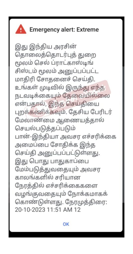 தேசிய பேரிடர் மேலாண்மை ஆணையத்தால் செயல்படுத்தப்படும் அகில இந்திய அவசர எச்சரிக்கை அமைப்பின் செயல்பாட்டை சரிபார்க்க இந்திய அரசின் தொலைத் தொடர்புத்துறையால் செல் ஒளிபரப்பு அமைப்பு மூலம் மாதிரி சோதனை பேரிடர் கால எச்சரிக்கை செய்தி (20.10.2023) அன்று செல்பேசிகளுக்கு அனுப்பப்பட உள்ளது.