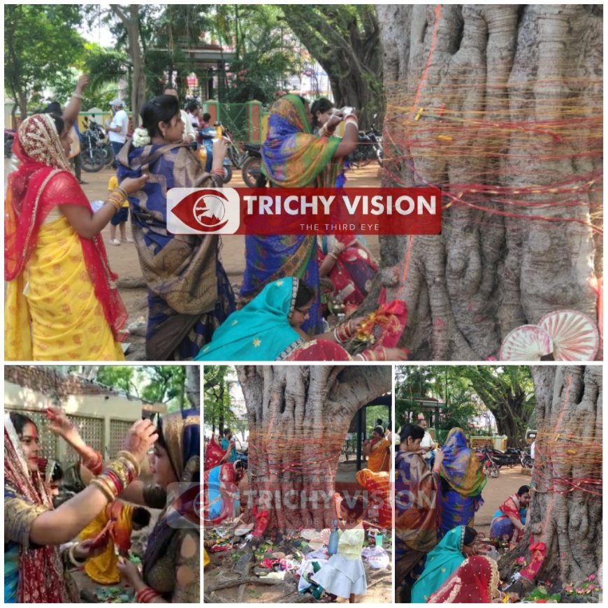 அதன்படி திருச்சி பொன்மலையில் வசிக்கும் வட மாநில பெண்கள் பொன்மலை ரயில்வே ஆர்மரி கேட் எதிரே உள்ள கோவில் ஆலமரத்தில் மங்களப் பொருட்கள் வைத்து வழிபாடு செய்து பின்னர் ஆலமரத்தை சுற்றிலும் கயிறு கட்டி தங்கள் கணவன் நீடுழி வாழ வேண்டி வழிபாடு மேற்கொண்டனர்.