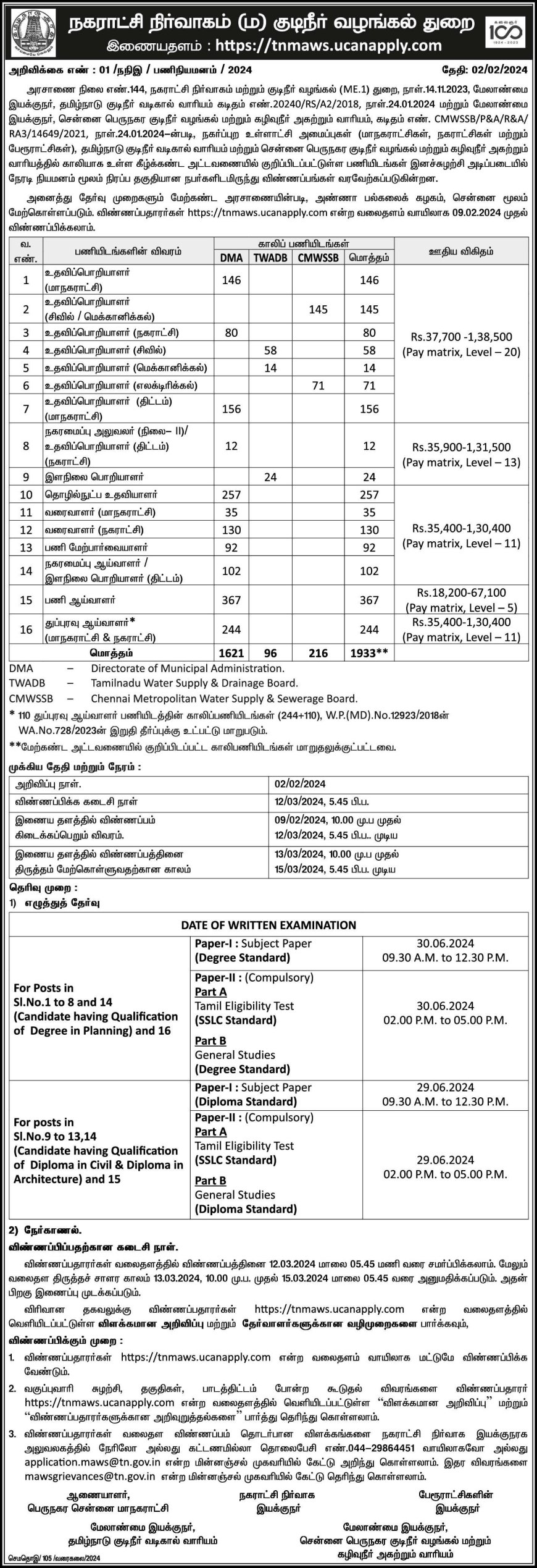 உதவியாளர், உதவிப் பொறியாளர், இளநிலை பொறியாளர் பதவிகளில் 1,933 காலியிடங்கள் இருப்பதால் www.tnmaws.ucanapply.com என்ற வலைதளம் மூலம் விண்ணப்பிக்கலாம் என நகராட்சி நிர்வாகத் துறை அறிவிப்பு.