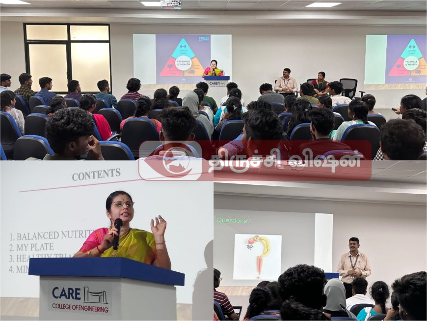 கேர் இன்ஜினியரிங் கல்லூரியில் “உணவுக்கும் வேடிக்கைக்கும் இடையே உள்ள சமநிலையைக் கண்டுபிடி” என்ற தலைப்பில் ஊட்டச்சத்து குறித்த விழிப்புணர்வு நிகழ்ச்சியை டிசம்பர் 9 ஆம் தேதி மாலை 3:30 மணிக்கு நடத்தியது. நாட்டு நல பணி திட்டம் (NSS) மற்றும் ECO CARE கிளப் ஆகியவற்றால் ஏற்பாடு செய்யப்பட்ட இந்தத் திட்டம், ஆரோக்கியமான உணவுப் பழக்கங்களைப் பற்றி மாணவர்களுக்குக் கற்பிப்பதை நோக்கமாகக் கொண்டுள்ளது.