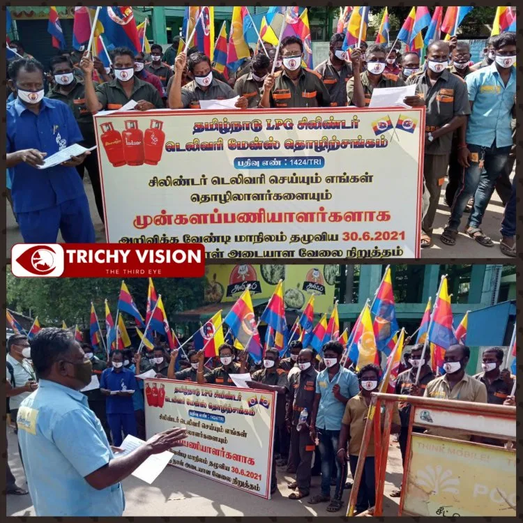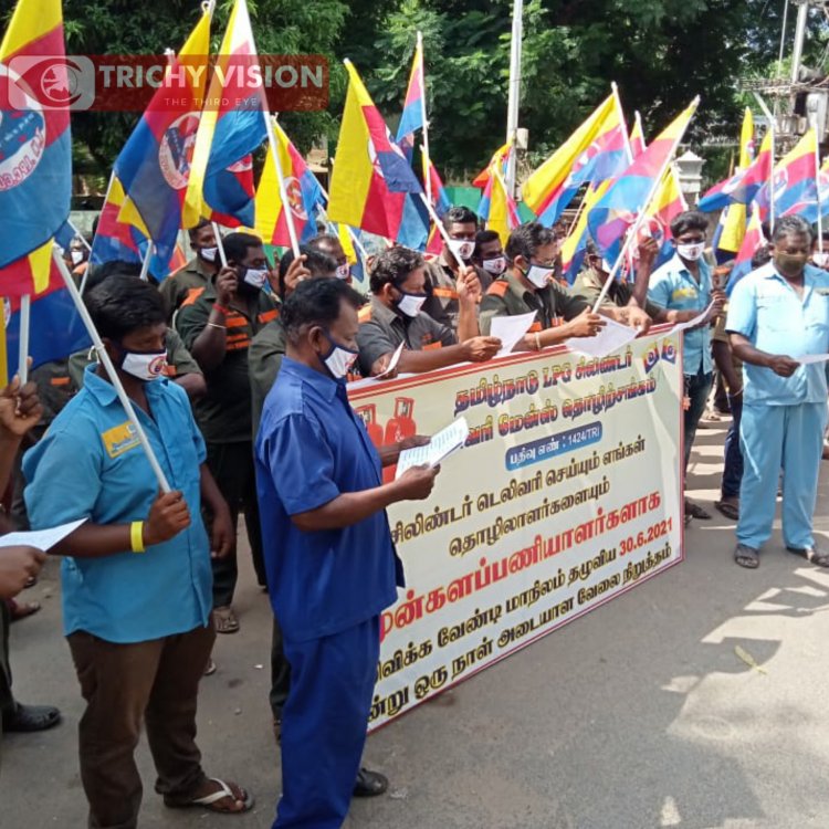 திருச்சி மத்திய பேருந்து நிலையம் அருகே தமிழ்நாடு எல்பிஜி சிலிண்டர் டெலிவரி மேன் தொழிற்சங்கம் சார்பாக ஒரு நாள் அடையாள வேலை நிறுத்தம் அறிவிக்கப்பட்டு ஆர்ப்பாட்டம் நடைபெற்றது. ஆர்ப்பாட்டத்தில் கலந்து கொண்ட தமிழ்நாடு எல்பிஜி சிலிண்டர் டெலிவரி மேன் சங்க மாநில தலைவர் கணேஷ் பேசும்பொழுது தங்களுடைய கோரிக்கைகளை முக்கியமாக முன்கள பணியாளர்களாக அறிவிக்கவேண்டும். இ.எஸ்.ஐ, பி எஃப் அதுமட்டுமில்லாமல் விபத்து காப்பீடு தங்களுக்கு வழங்க வேண்டும் என்றார்.