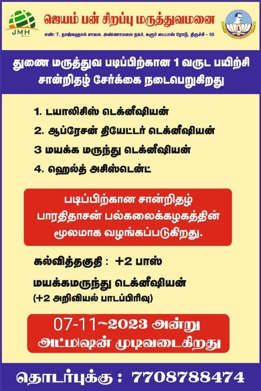 திருச்சி – கரூர் பைபாஸ் ரோடு அண்ணாமலை நகரில் செயல்பட்டு வரும் ஜெயம் பன் சிறப்பு மருத்துவமனையில் துணை மருத்துவ படிப்பிற்கான ஒரு வருட பயிற்சி சான்றிதழ் சேர்க்கை நடைபெறுகிறது.