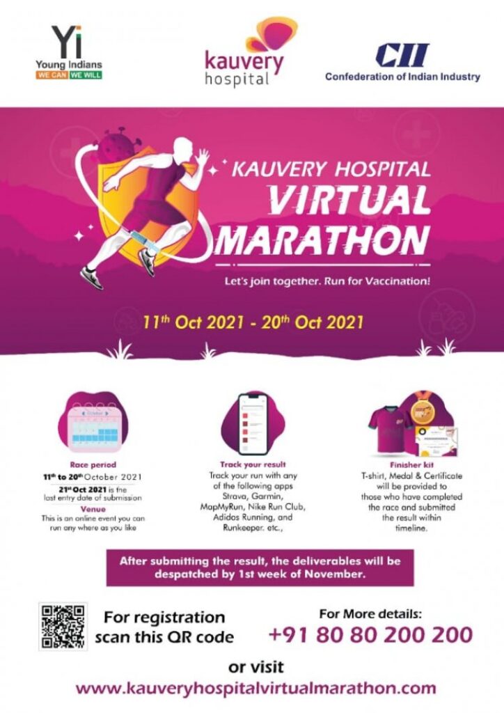 திருச்சி காவேரி மருத்துவமனை, CII மற்றும் யங் இந்தியன்ஸ் இணைந்து கொரோனா தடுப்பூசியை பொதுமக்கள் அனைவரும் செலுத்திக் கொள்ள வேண்டும் என்பதை வலியுறுத்தி ஒரு விழிப்புணர்வு மாரத்தான் ஓட்டத்தை இணையவழியில் ஏற்பாடு செய்துள்ளனர்.