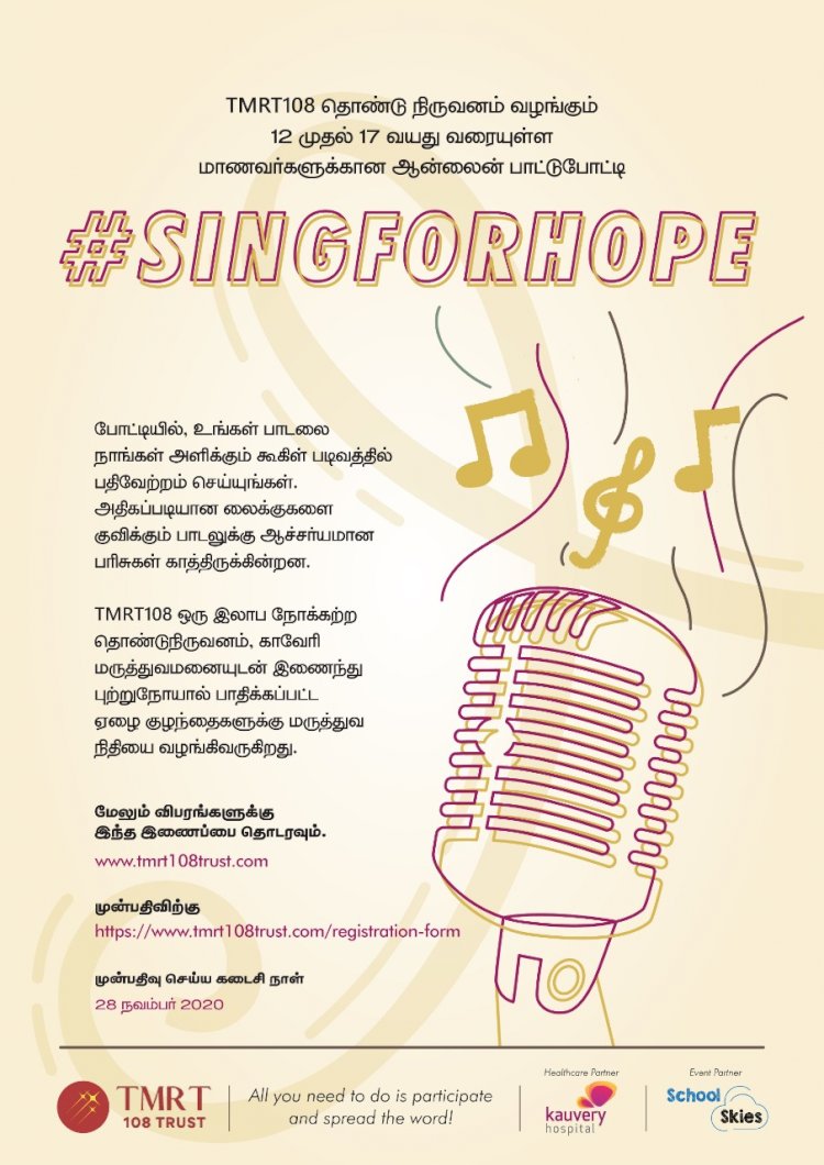 அந்த வகையில் TMRT108 தொண்டு நிறுவனம் வழங்கும் 12 முதல் 17 வயது வரையுள்ள மாணவர்களுக்கான ஆன்லைன் பாட்டுப்போட்டி #SINGFORHOPE.