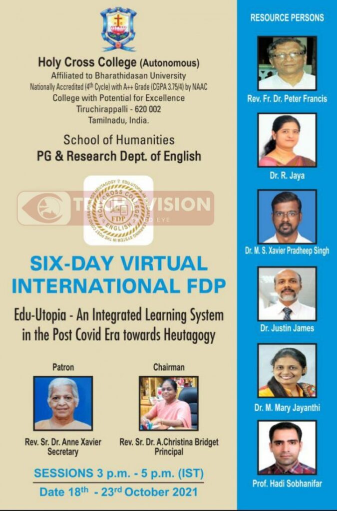 திருச்சி ஹோலிகிராஸ் கல்லூரியில் ஆசிரியர்களுக்கான திறன் மேம்பாட்டு பயிற்சி இணையவழியில் நடைபெறுகிறது.அக்டோபர் 18 முதல் 23 வரை ஆறு நாட்கள் தொடர்ந்து மாலை 3 மணி முதல் 5 மணிவரை இணையவழியில் ஆசிரியர் திறன் மேம்பாட்டு பயிற்சி வழங்கப்படும்.