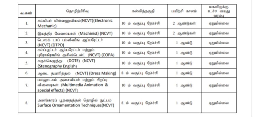 திருச்சிராப்பள்ளி மாவட்டம், இலால்குடி வட்டம், புள்ளம்பாடியில் உள்ள மகளிர் அரசு தொழிற்பயிற்சி நிலையத்தில் ஆகஸ்ட் 2024 ஆம் ஆண்டிற்கான நேரடி சேர்க்கைக்கான விண்ணப்பங்கள் வரவேற்கப்படுகின்றன. (01.07.2024) முதல் (15.07.2024) வரை நடைபெறவுள்ள நேரடி சேர்க்கையில் சேர இத்தொழிற்பயிற்சி நிலையத்திற்கு நேரில் வந்து விண்ணப்பிக்கலாம். விண்ணப்பிக்க கடைசி நாள் : (15.07.2024)