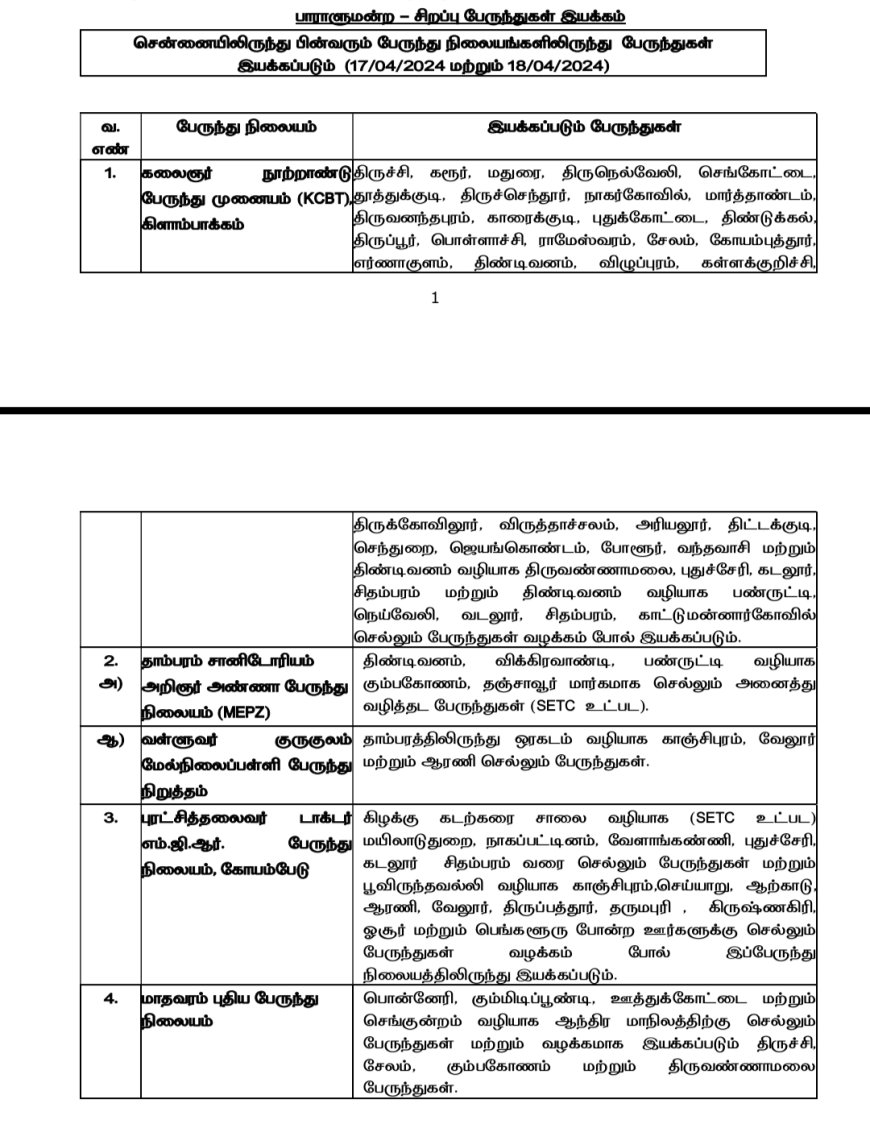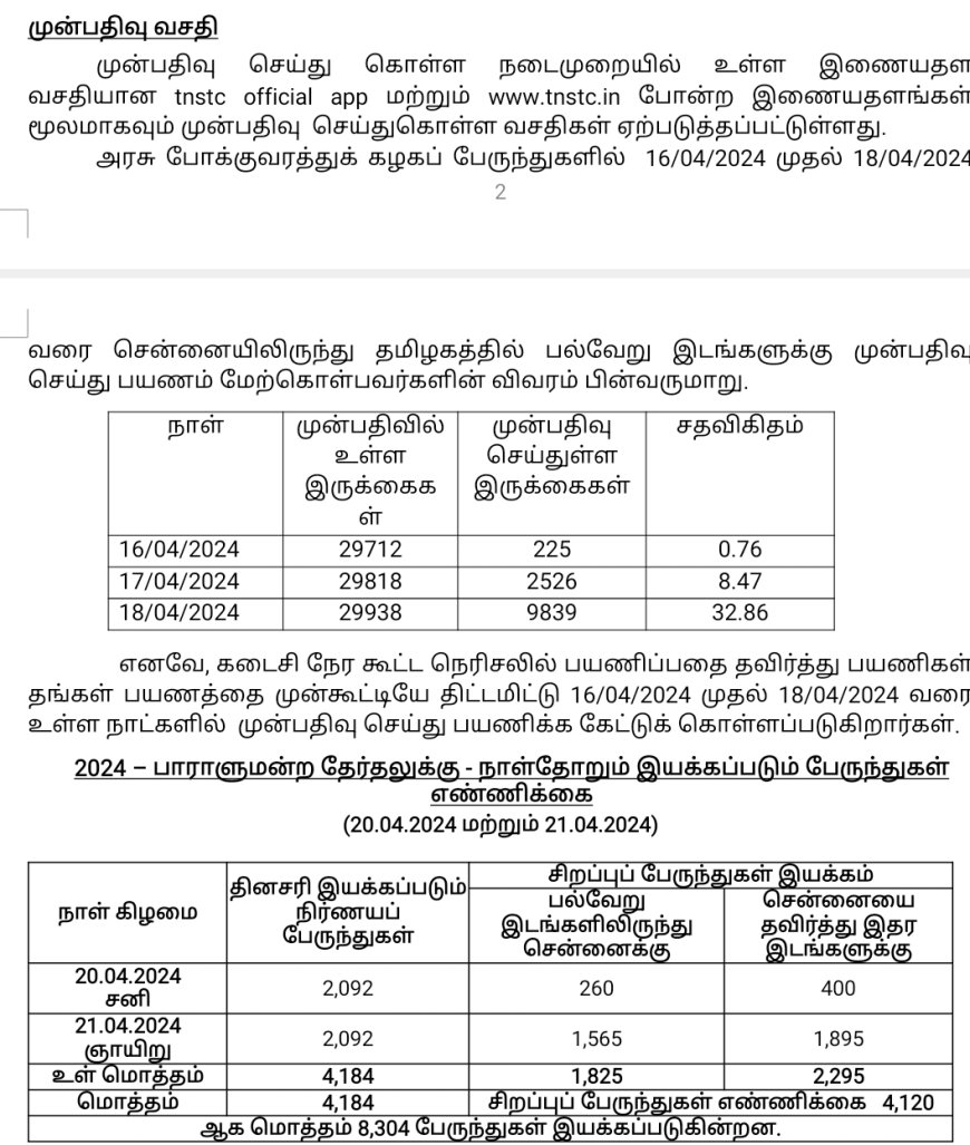 அதில், “2024 – பாராளுமன்ற தேர்தல் 19.04.2024 அன்று நடைபெறுவதை முன்னிட்டு, பொது மக்கள் தங்களின் சொந்த ஊர்களுக்கு சென்று வாக்களித்திட வசதியாக சிறப்பு பேருந்துகள் இயக்கப்பட உள்ளன.
